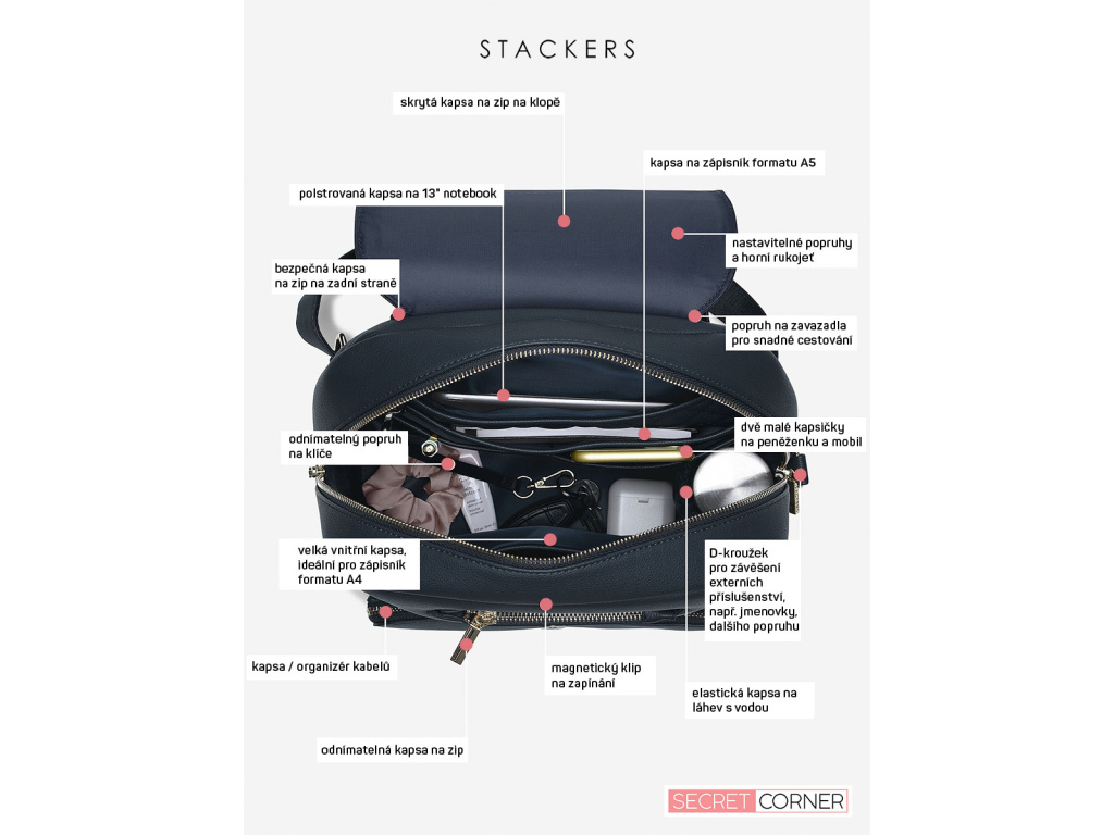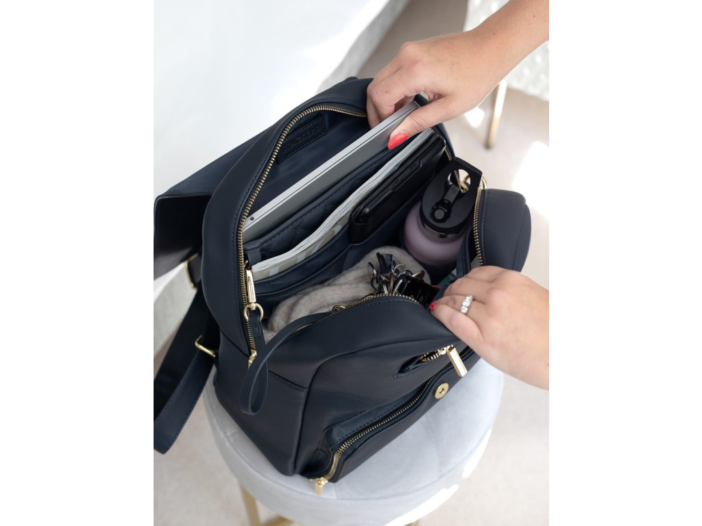 Vneste do každého dne nějaký řád. S tímto dámským batohem nebudou žádné výmluvy, proč nezůstat super organizovaný. Náš batoh s vnějším povrchem z umělé kůže obsahuje velké vnitřní polstrované pouzdro na váš notebook (až 13 palců), několik kapes, prostor pro láhev s pitím a velkou přihrádku na všechny vaše každodenní nezbytnosti. Na zadní straně a na vnitřní straně víka jsou další kapsy na zip a také velká kapsa na zip s elastickými přihrádkami na menší příslušenství. K doplnění této tašky je na přední straně integrovaná kapsa s malou odnímatelnou kapsičkou na zip na mince. Životní cesta, zjednodušené... Buďte nejorganizovanější verzí sebe sama s kolekcí tašek Stackers Klíčové vlastnosti: • Prostor pro notebook (až 13 palců) • Nastavitelné popruhy • Včetně kabelky na mince • Více vnitřních a vnějších kapes • Elastické vnitřní nápoje kapsa • Hodí se přes držadla kufru • Ochranné cvočky na základně • Přední kapsa vestavěný kabel uklizený • Přidejte personalizovanou klíčenku • K dispozici v barvách Blush, Taupe a Black