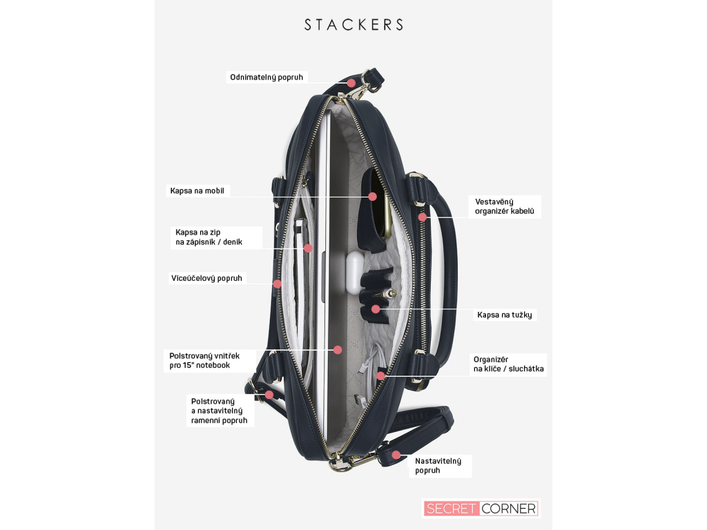 Má dostatek prostoru pro váš notebook o velikosti až 15 palců, váš telefon, tužky, kabely a další drobnosti. Navíc tu máme ještě velkou kapsu se zipem, kam si můžete uložit větší věci, které potřebujete mít po ruce.