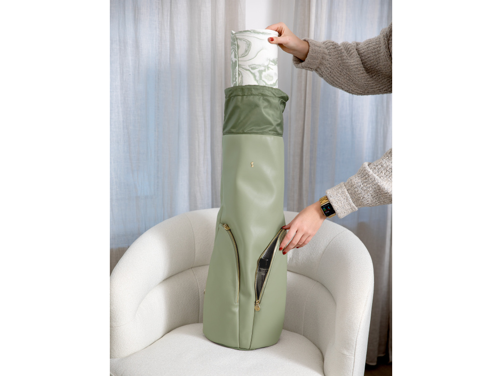 Uvnitř tašky je velká část, která se perfektně vejde na vaši srolovanou podložku na jógu nebo pilates, takže ji můžete po použití zasunout a vyndat.