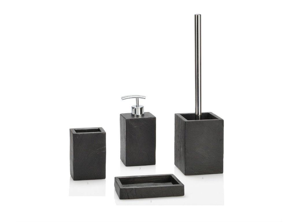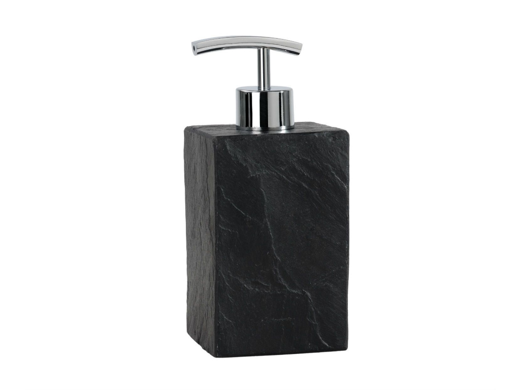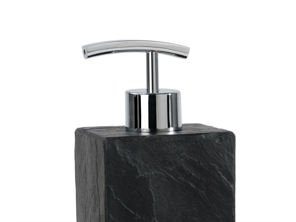 Textura a tmavě šedá barva břidlice dodávají tomuto koupelnovému doplňku rustikální nádech a postříbřený dávkovač ze slitiny zinku z něj dělá výrazný a elegantní kousek.