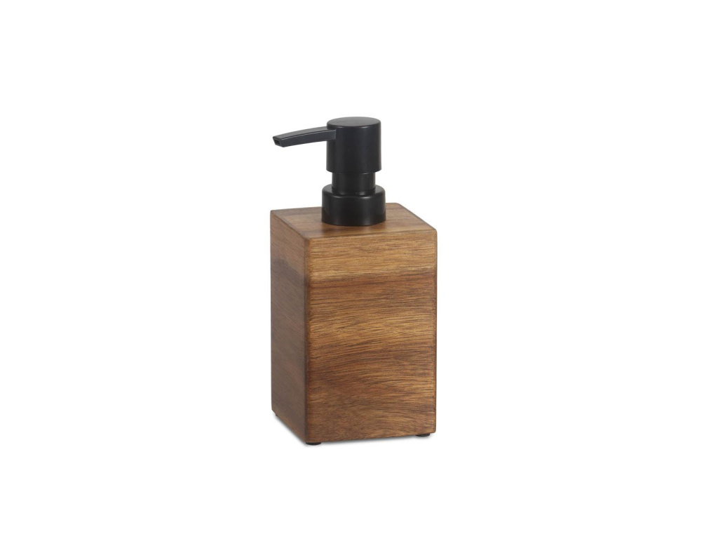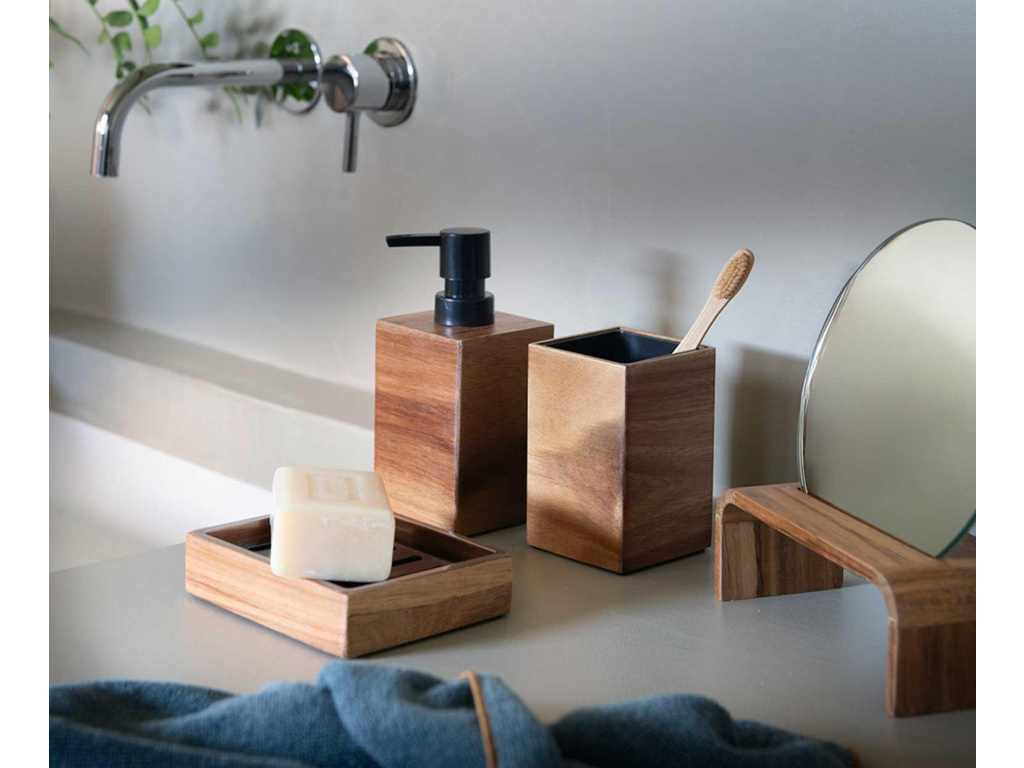 Koupelnový dávkovač z tmavého akáciového dřeva, s černým dávkovačem.