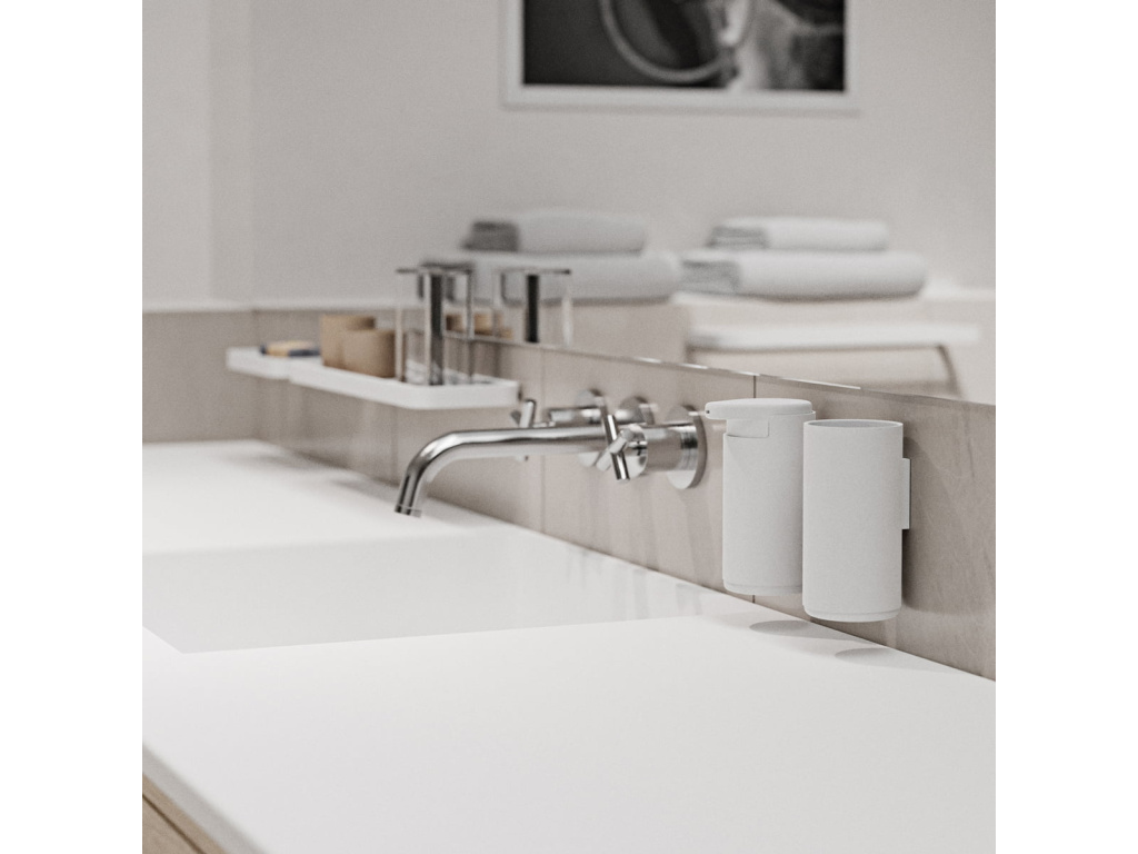 Produkty řady jsou k dispozici v černé a bílé barvě a jsou vyrobeny z robustního hliníku s práškovým nástřikem a samozřejmě se snadno čistí. Několik z nich lze namontovat na stěnu, takže se snadno používají, podporuje to hygienu i estetiku.