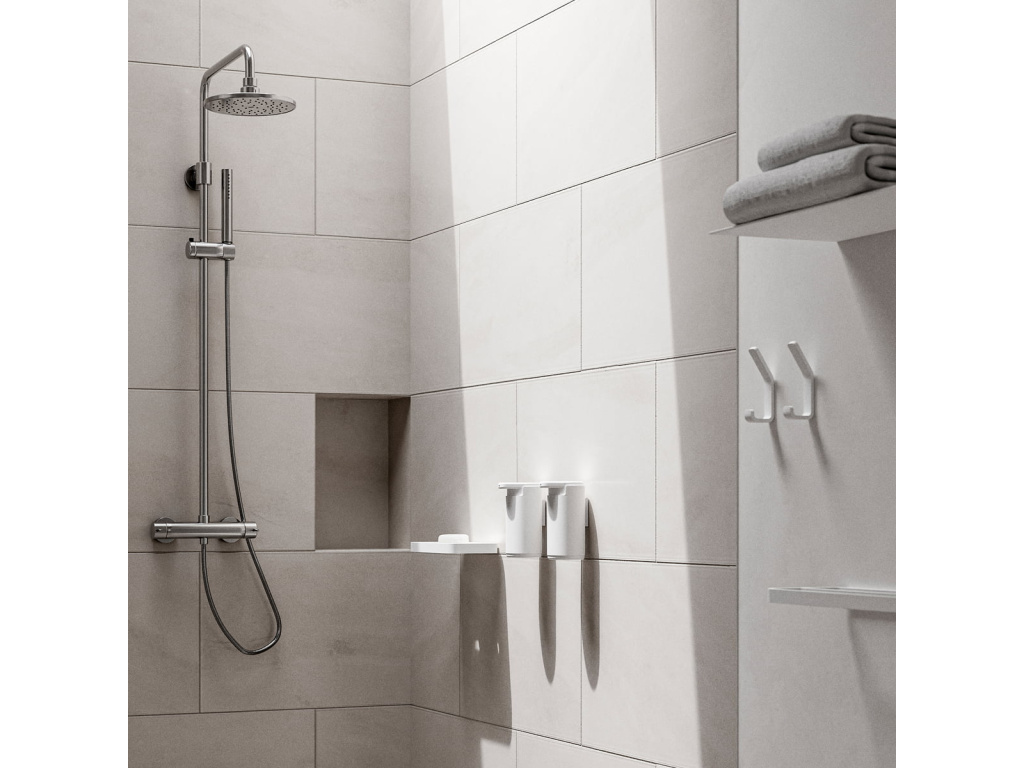 Produkty řady jsou k dispozici v černé a bílé barvě a jsou vyrobeny z robustního hliníku s práškovým nástřikem a samozřejmě se snadno čistí. Několik z nich lze namontovat na stěnu, takže se snadno používají, podporuje to hygienu i estetiku.