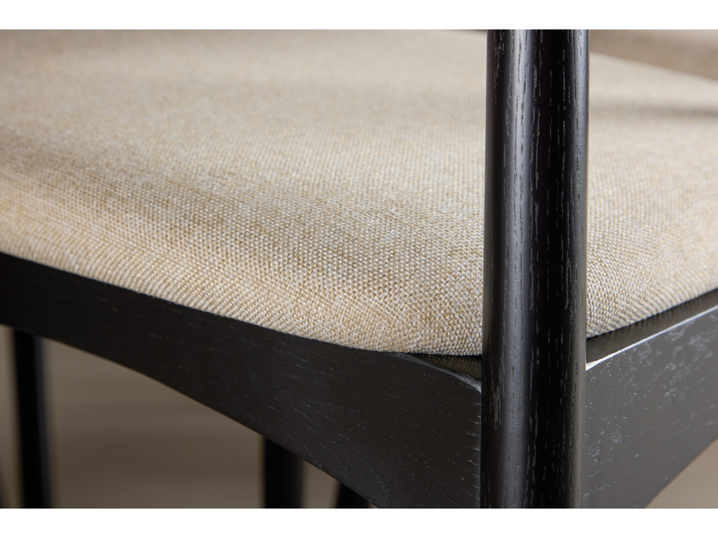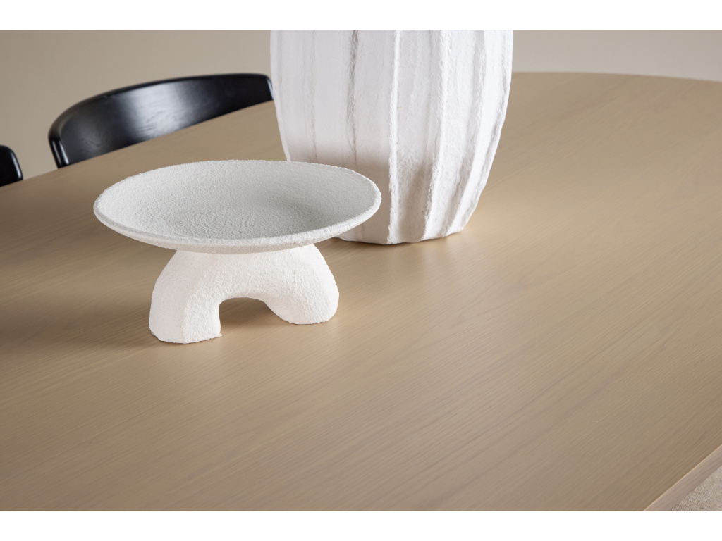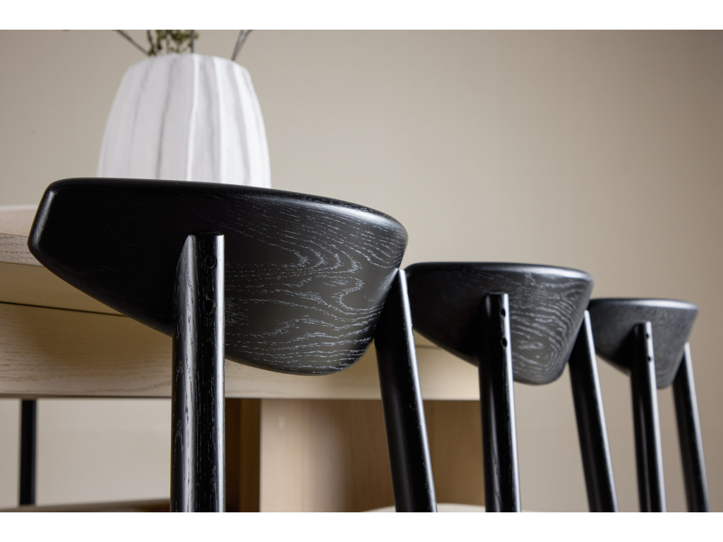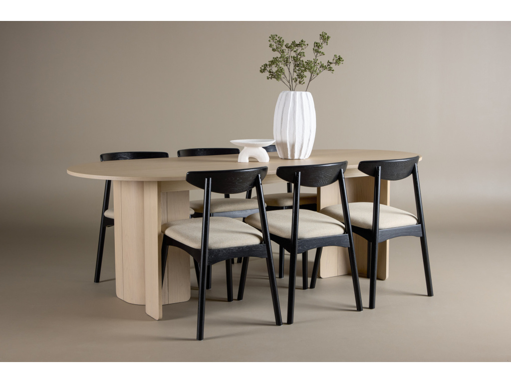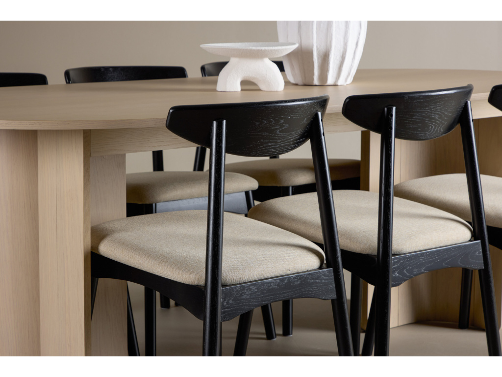 Kolem stolu jsou židle Ven s černými rámy a měkkými béžovými sedáky – elegantní kontrast, který dodává celku hloubku a charakter.