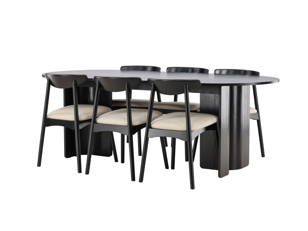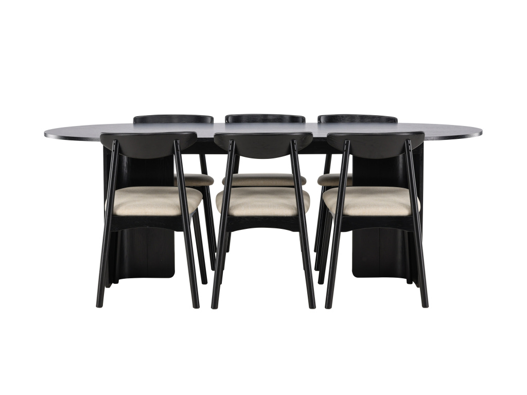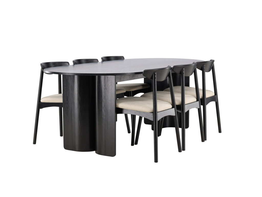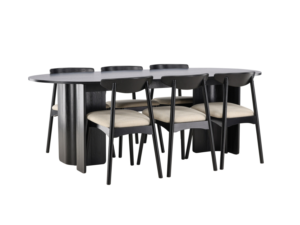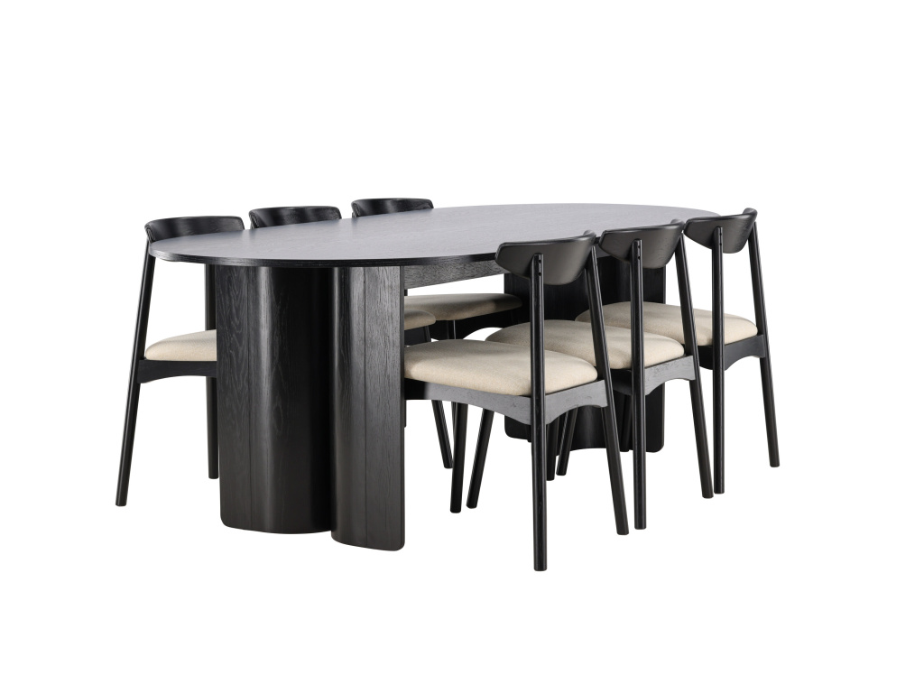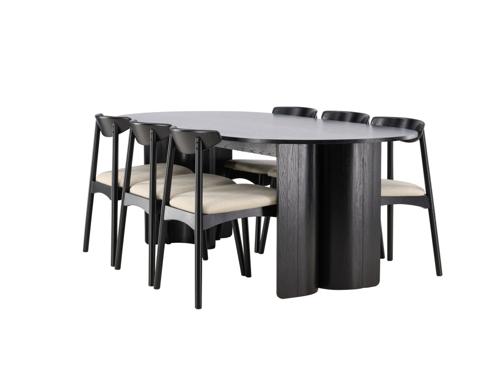 Vytvořte si moderní a příjemný jídelní prostor s jídelní sadou Tyresö & Ven, která kombinuje elegantní design s praktickou funkcí. Obdélníkový stůl Tyresö se vyznačuje jemně zaoblenými hranami a elegantní černou povrchovou úpravou, která mu dodává výrazný a sofistikovaný vzhled. Součástí sady jsou židle Ven s černým rámem, který ladí se stolem, zatímco béžový sedák dodává hřejivý a jemný kontrast. Společně tvoří vyváženou kompozici, která se hodí jak pro každodenní jídla, tak pro větší setkání. Jídelní sada, která je ztělesněním moderní jednoduchosti, pohodlí a kontrastu – ideální pro každého, kdo chce vylepšit svůj jídelní kout stylově.