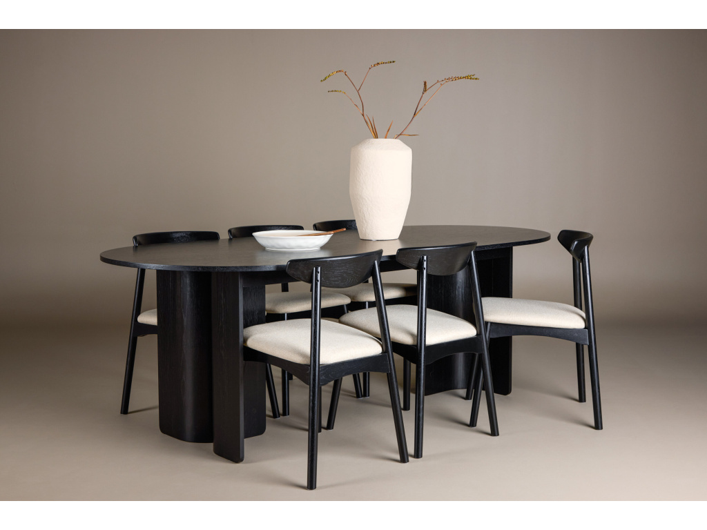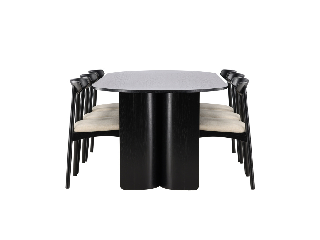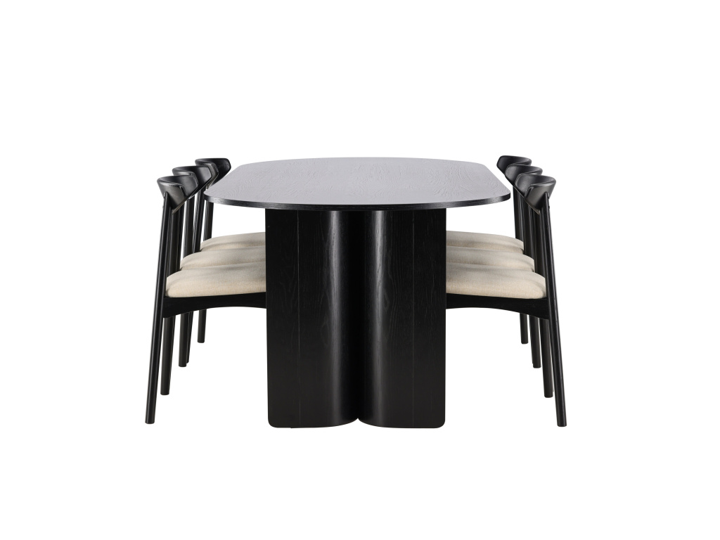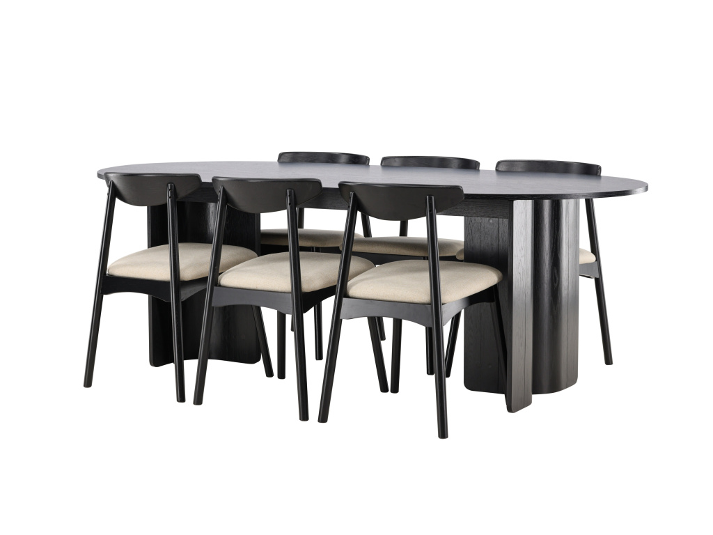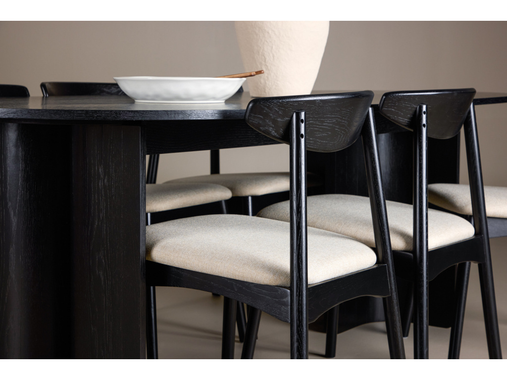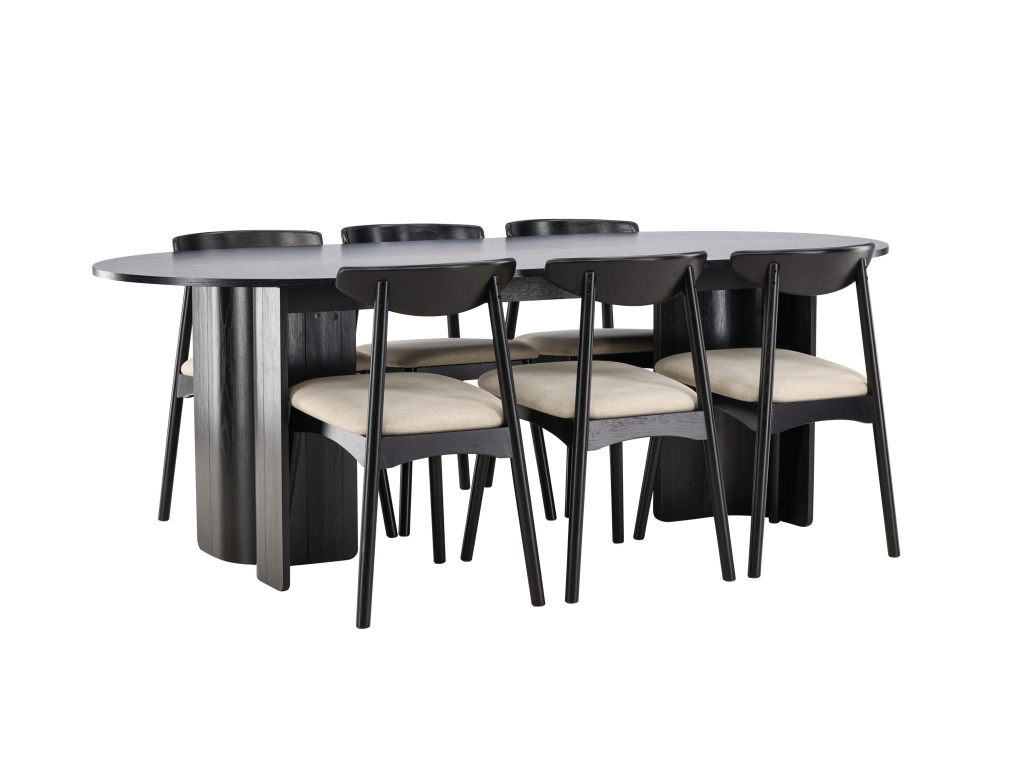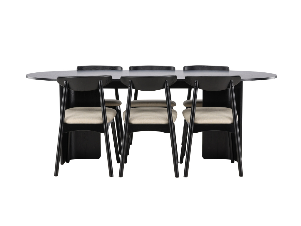 Vytvořte si moderní a příjemný jídelní prostor s jídelní sadou Tyresö & Ven, která kombinuje elegantní design s praktickou funkcí. Obdélníkový stůl Tyresö se vyznačuje jemně zaoblenými hranami a elegantní černou povrchovou úpravou, která mu dodává výrazný a sofistikovaný vzhled. Součástí sady jsou židle Ven s černým rámem, který ladí se stolem, zatímco béžový sedák dodává hřejivý a jemný kontrast. Společně tvoří vyváženou kompozici, která se hodí jak pro každodenní jídla, tak pro větší setkání. Jídelní sada, která je ztělesněním moderní jednoduchosti, pohodlí a kontrastu – ideální pro každého, kdo chce vylepšit svůj jídelní kout stylově.