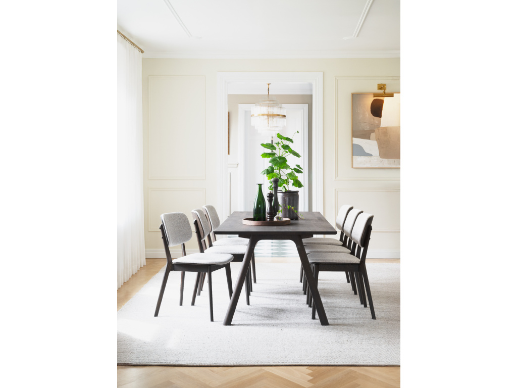 Clapperton je masivní jídelní stůl z hnědého dubu s výraznou designovou identitou a vysokým vizuálním dopadem. Vyrobeno v Evropě s velkou péčí o estetiku i udržitelnost. Dřevo s certifikací FSC® je spojováno prstovými spoji pro výrazný výraz a charakter, a je také ošetřeno olejem Rubio, který zdůrazňuje přirozenou texturu a jedinečný tón dřeva. Design harmonicky spojuje rovné a zakřivené linie. Nohy zahnuté směrem ven se setkávají v elegantním spoji, kde každý pár nohou tvoří jeden tvarovaný prvek, jemný, ale…