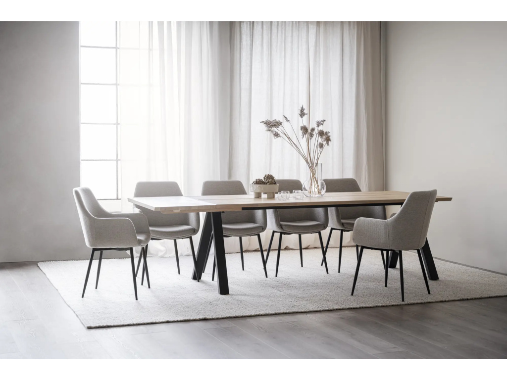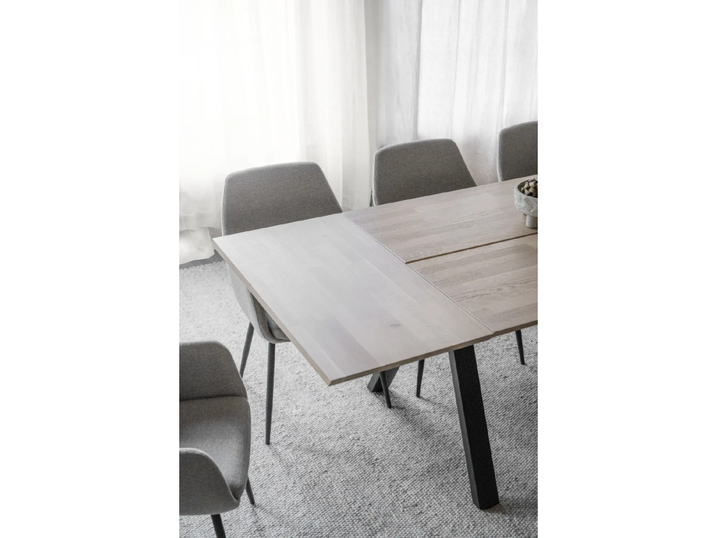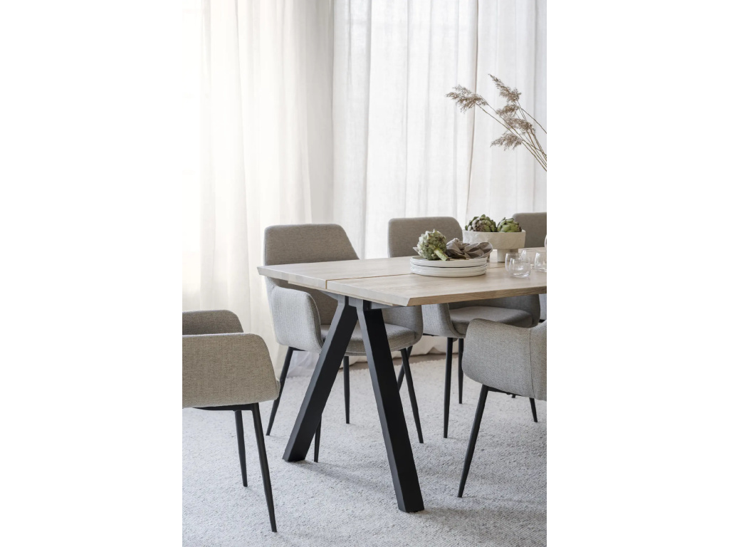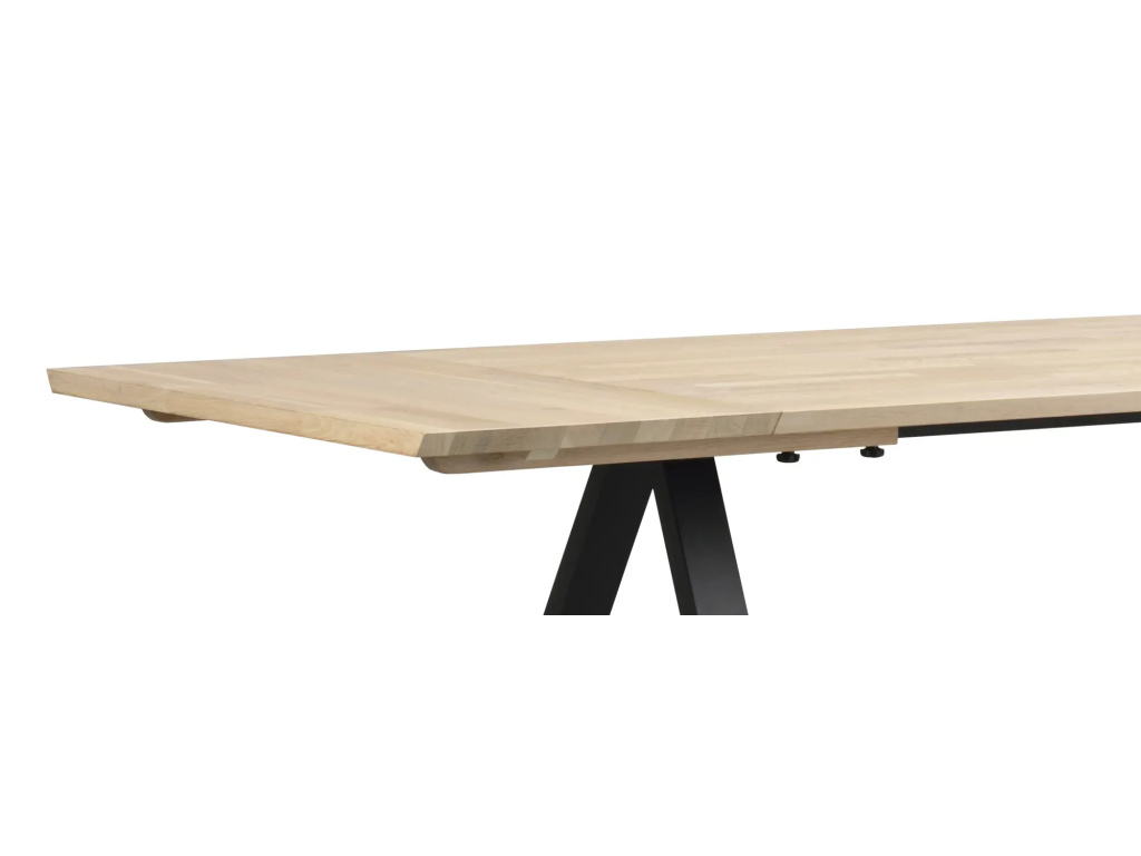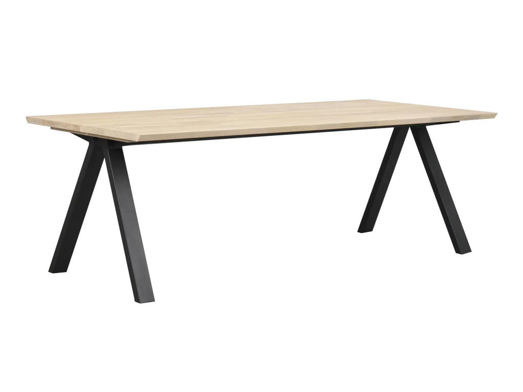 Dvoudílná masivní stolová deska s kartáčovaným povrchem a práškově lakovanými černými kovovými nohami ve tvaru V.