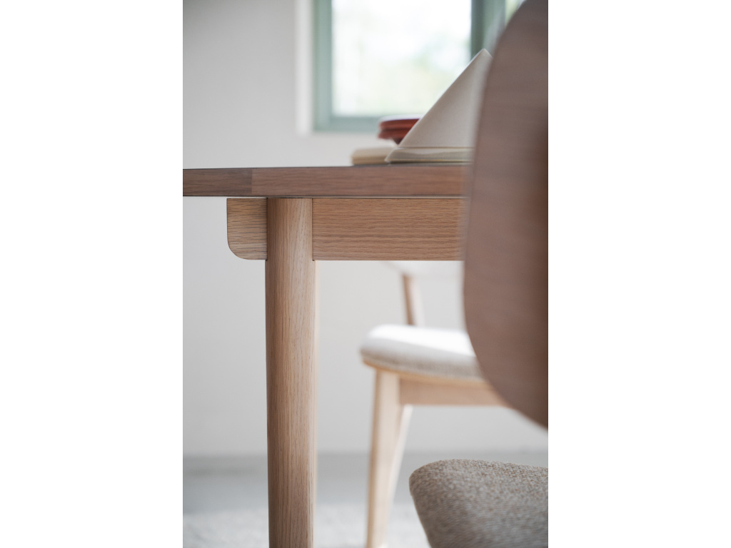 Fairmount je elegantní jídelní stůl z běleného dubu s lehkým a vzdušným designem. Deska stolu je vyrobena z odolného vysokotlakého laminátu, díky čemuž je odolná vůči poškrábání a vlhkosti, a je ideální jak pro každodenní život, tak pro slavnostní příležitosti. Béžová barva desky stolu v kombinaci s dýhovaným dřevěným lemováním a masivními dubovými nohami umožňuje, aby se stůl bez problémů začlenil do většiny domácností. Řemeslným detailem pod stolem je jemně tvarovaná zástěra, která přesahuje nohy, což je…