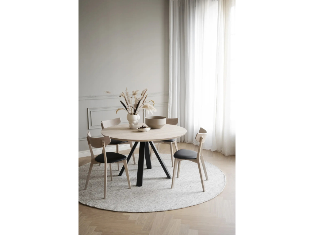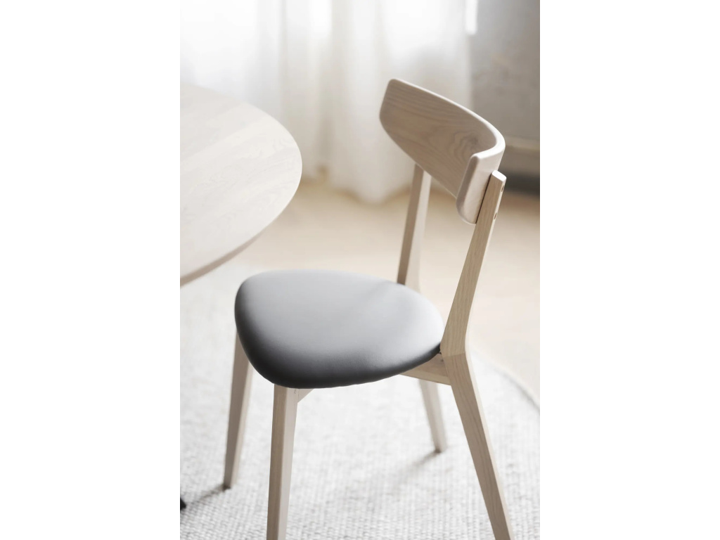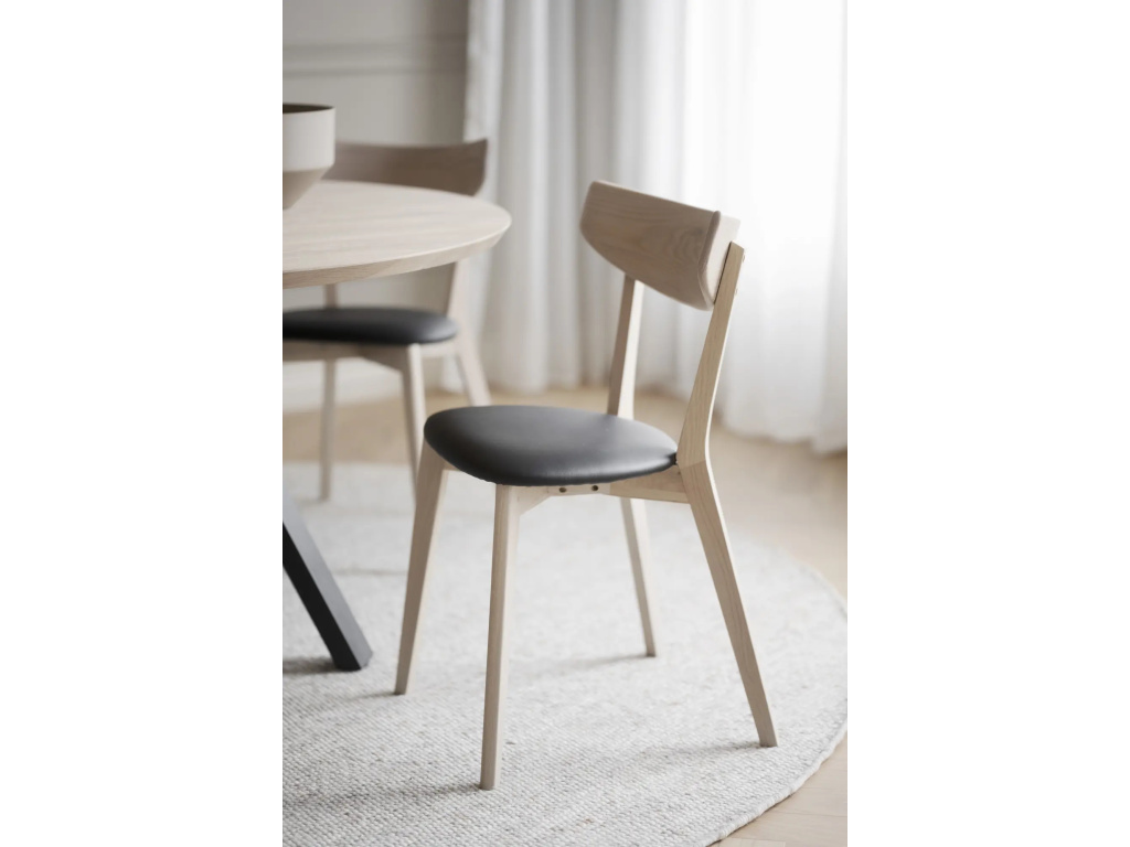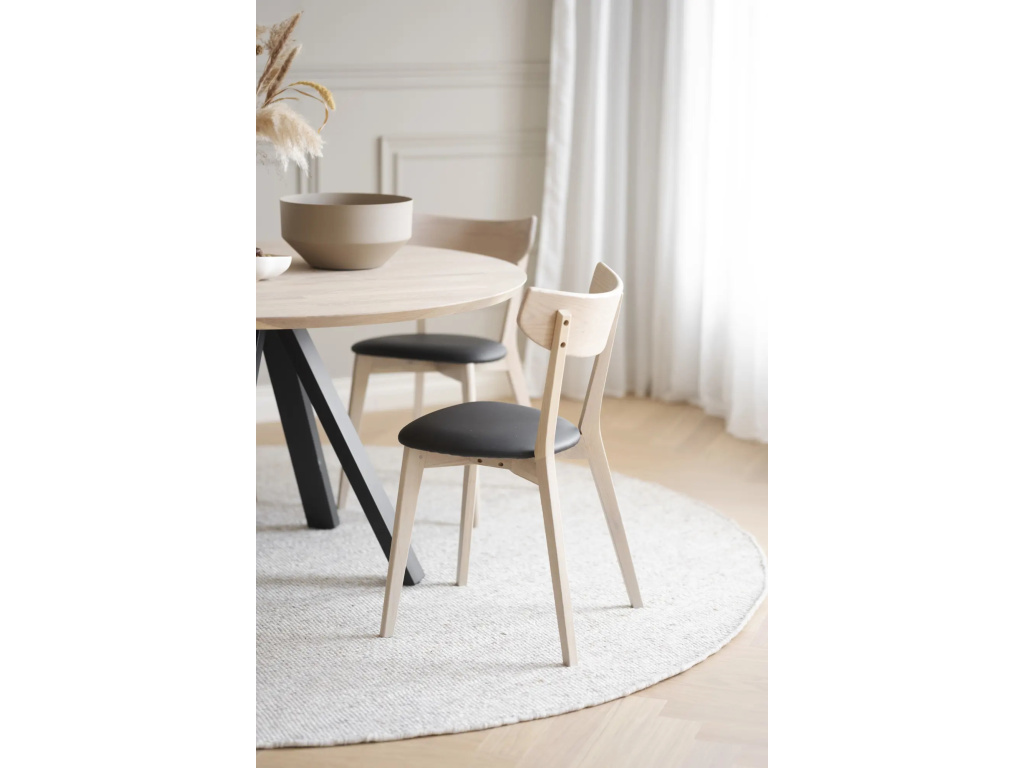 Moderní a elegantní jídelní židle Rowico Ami Chair Black přináší čistý, minimalistický design, který dokonale zapadne do každého interiéru. Černý sedák z imitace kůže zajišťuje pohodlí při sezení a dodává židli luxusní vzhled. Dubové nohy se světle hnědým lakováním poskytují nejen pevnou oporu, ale i estetický kontrast k měkkému sedáku.
