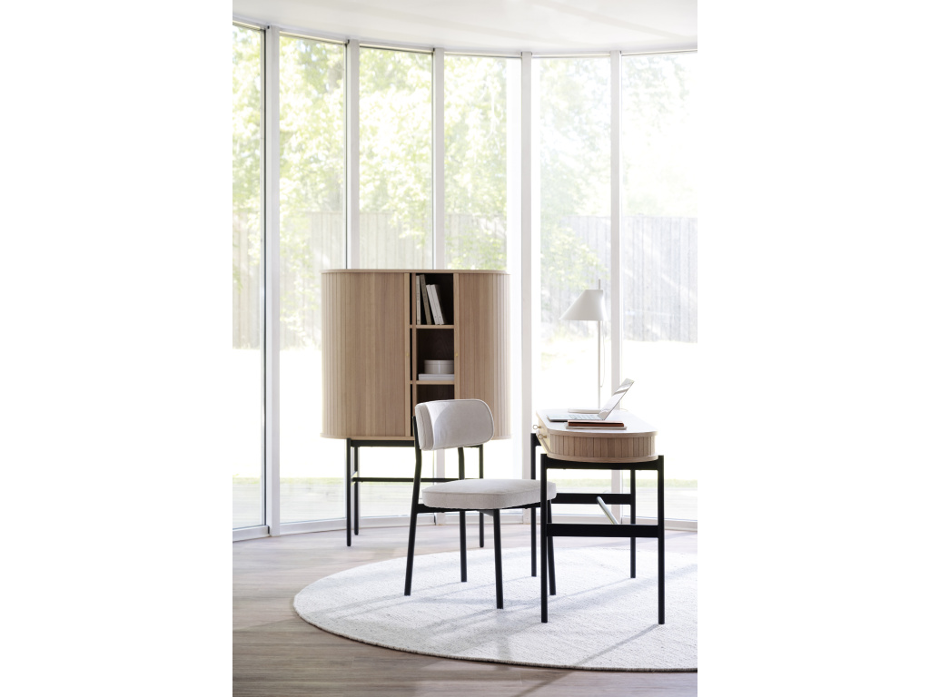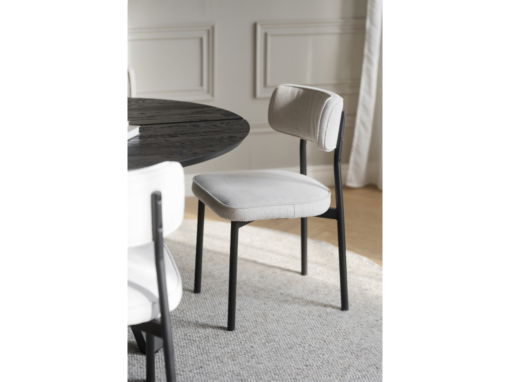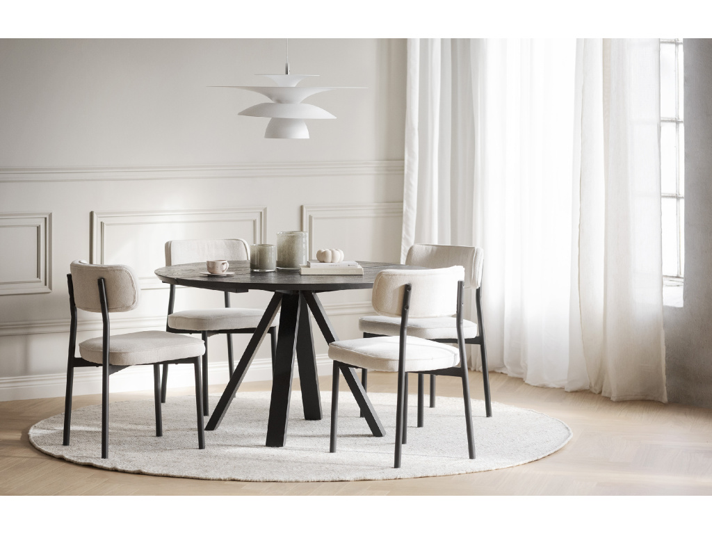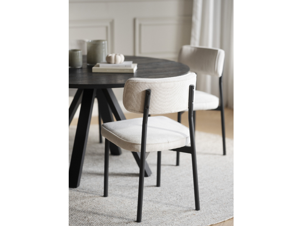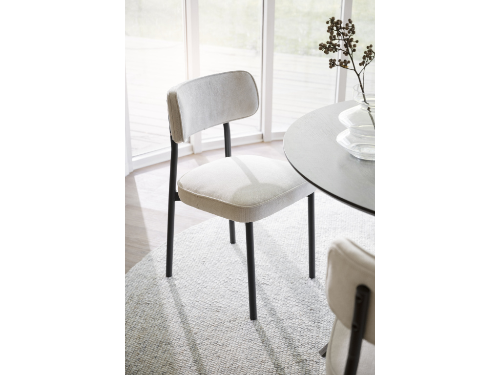Elegantní design a komfort Jídelní židle Paisley nabízí dokonalou rovnováhu mezi funkčností a designem. S čalouněním vyrobeným z recyklovaných PET lahví přináší ekologický přístup k modernímu interiéru. Béžová látka a černé kovové nohy dodávají této židli sofistikovaný vzhled, který perfektně zapadne do moderních jídelních prostor.