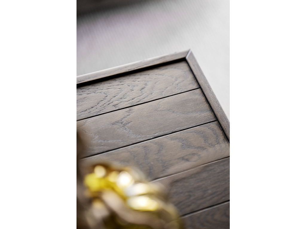 Deerfield konferenční stolek kombinuje čisté linie a přírodní materiály, které se ideálně hodí do moderních a minimalistických interiérů. Horní deska z dubové dýhy je zdobená vzorem rybí kosti, což jí dodává na jedinečnosti.
