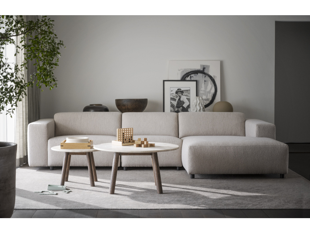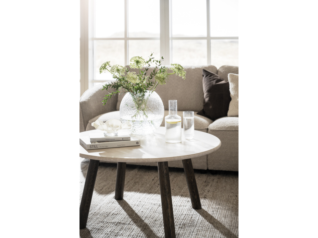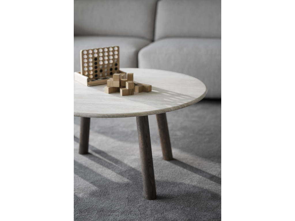 Tento stolek vyniká minimalistickým, moderním designem, který dokonale ladí s přírodními materiály a dřevem s certifikátem FSC. Díky svému kulatému tvaru a jemným tónům v béžové a hnědé barvě se hodí do obývacích pokojů a dalších prostor.