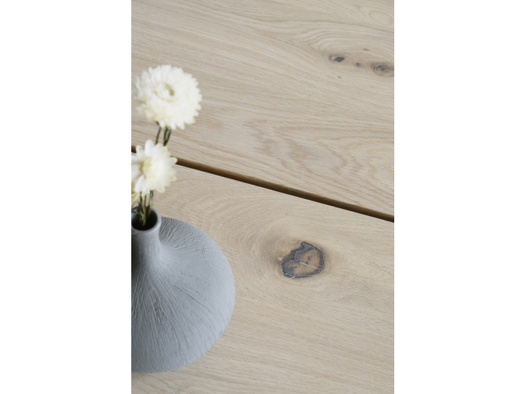 Konferenční stolek Melville přináší dokonalou rovnováhu mezi přírodou a moderním stylem. Deska stolu je vyrobena z divoké dubové dýhy, která se vyznačuje unikátní strukturou a suky, což zaručuje, že každý kus je jedinečný. Lakovaný povrch chrání dřevo a zvyšuje jeho odolnost, zatímco masivní dubové hrany dodávají stolku robustní a odolný vzhled.