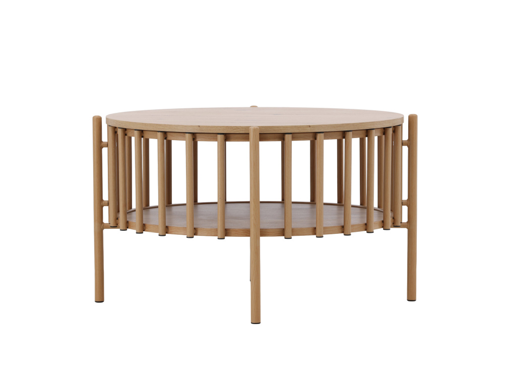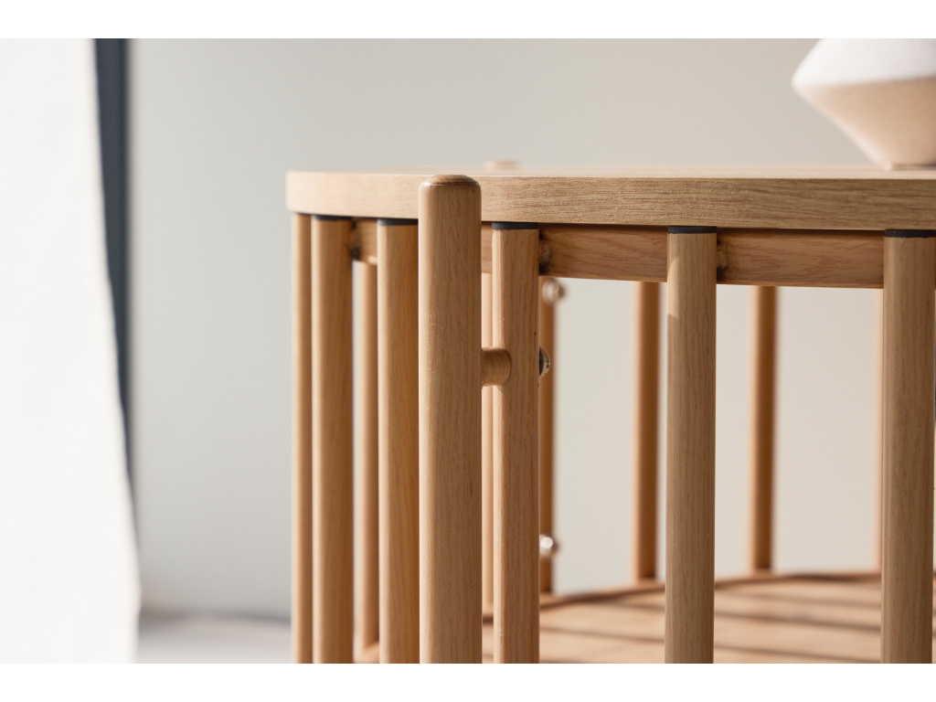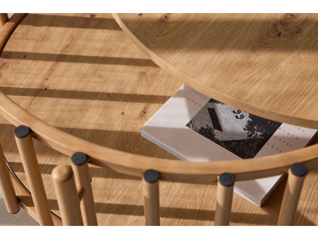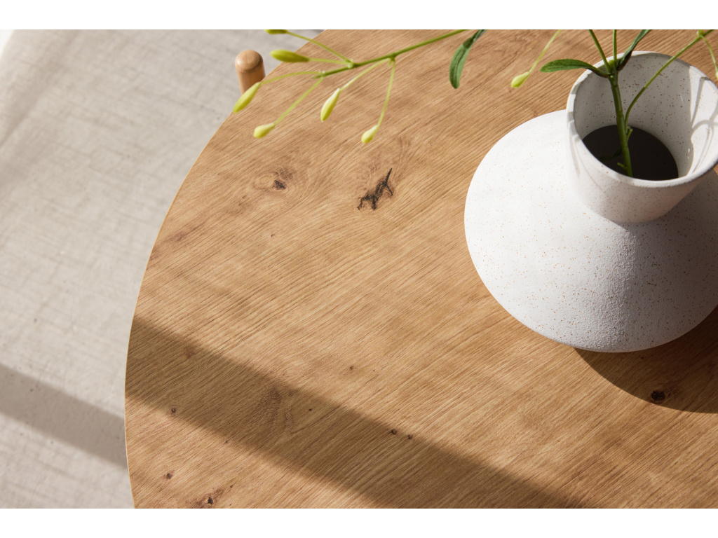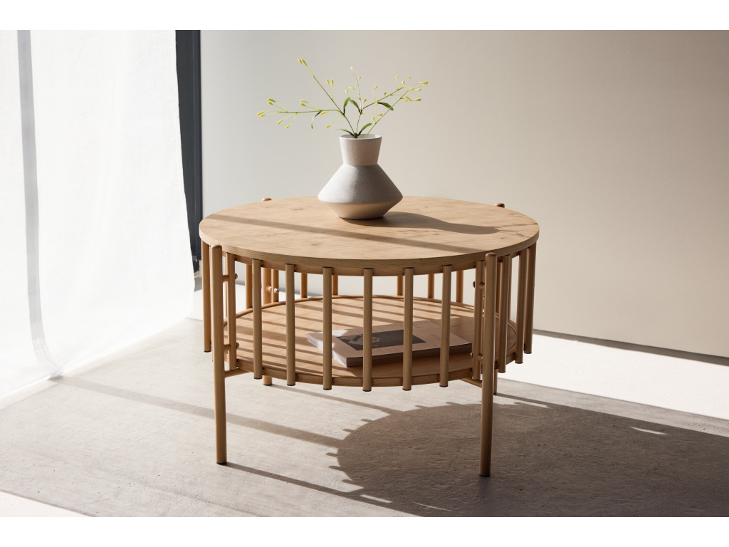 Rubbo je víc než jen konferenční stolek – je to vyjádření skandinávského designového cítění a přirozeného kouzla. Díky svému kulatému tvaru a žebrovanému designu vytváří Rubbo v místnosti harmonickou a živou atmosféru. Svislé lamely po stranách stolu dodávají dynamickou strukturu a jedinečný designový jazyk, který přitahuje pozornost, aniž by zahlcoval prostor. Rubbo, vyrobený s teplým, přírodním vzhledem dřeva, se bez problémů hodí do většiny interiérových stylů. Čtyři nohy jsou dovedně integrovány do designu a decentně, ale promyšleně kopírují tvar stolu, čímž mu dodávají vyváženou siluetu. Rubbo je perfektní volbou pro každého, kdo hledá elegantní a charakteristický konferenční stolek s něčím navíc.