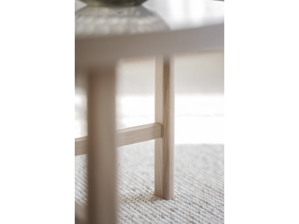 Nohy stolku jsou vyrobeny z masivního dubu, který je FSC certifikovaný, což garantuje šetrné a udržitelné využívání dřeva. Dubové nohy jsou pevné a stabilní, s elegantním křížovým uspořádáním, které dodává stolku moderní vzhled a stabilitu.