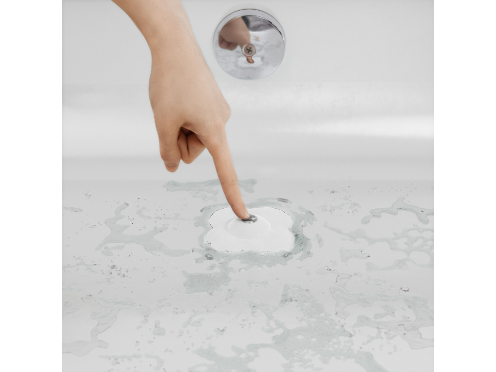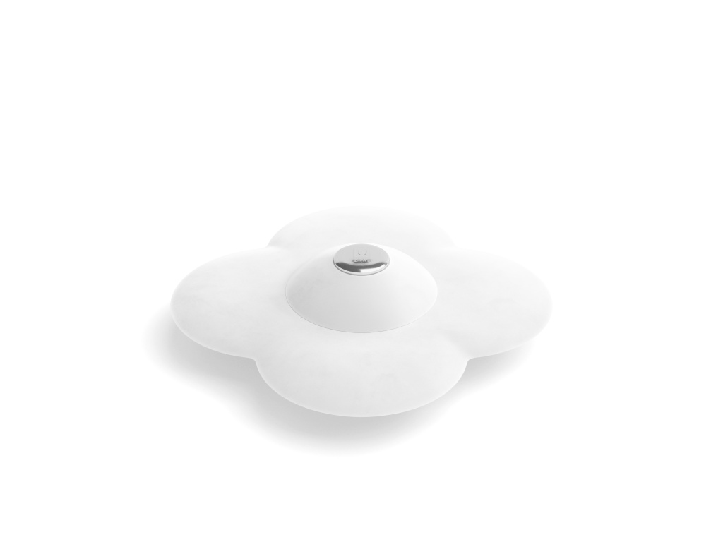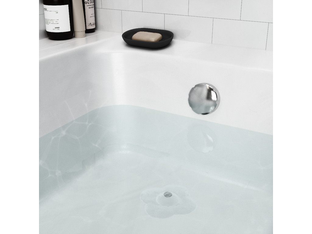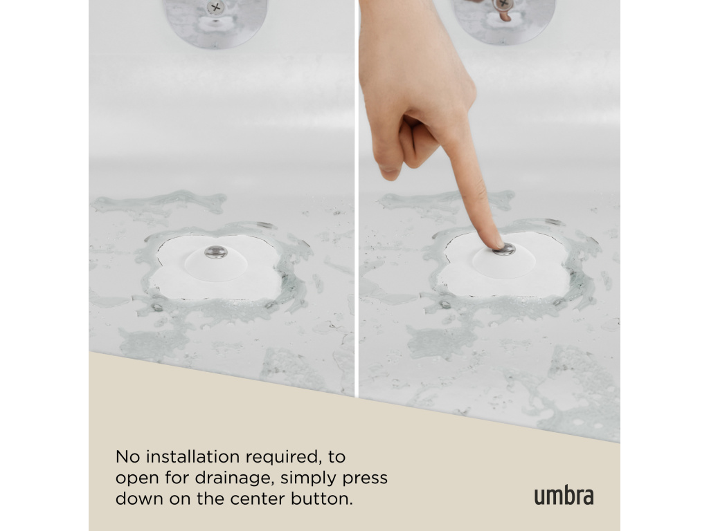 Stiskněte prostřední tlačítko Bloom pro uvolnění toku vody a použijte jej jako lapač vlasů, zatlačte na ohnuté okraje pro uzavření ventilu a použijte jej jako zátku odtoku.