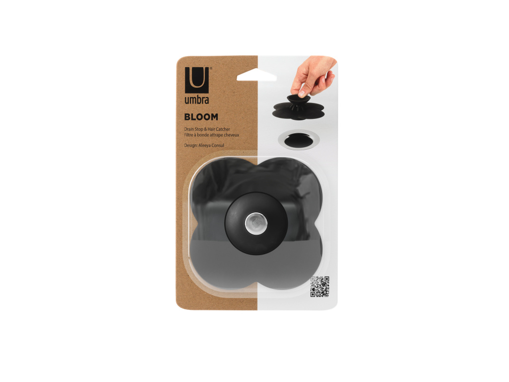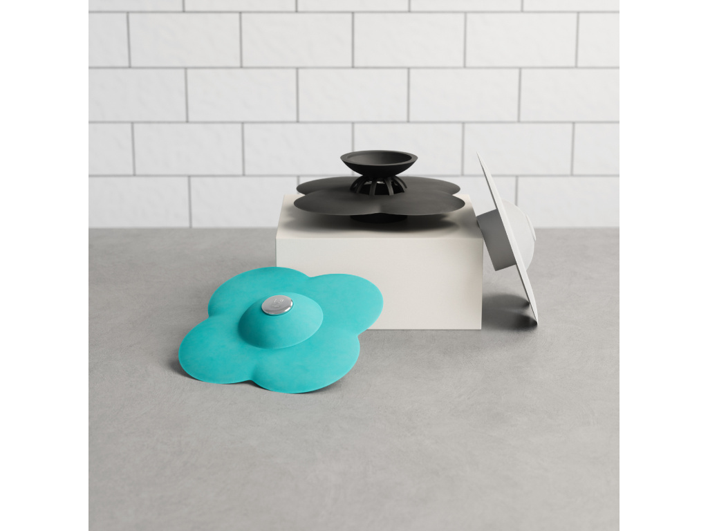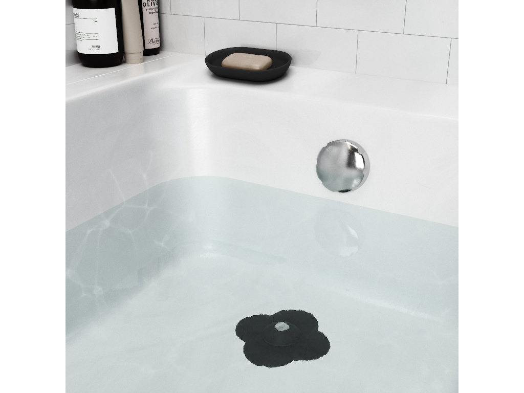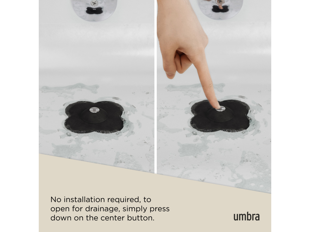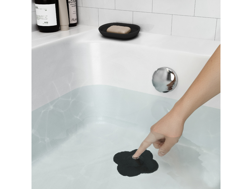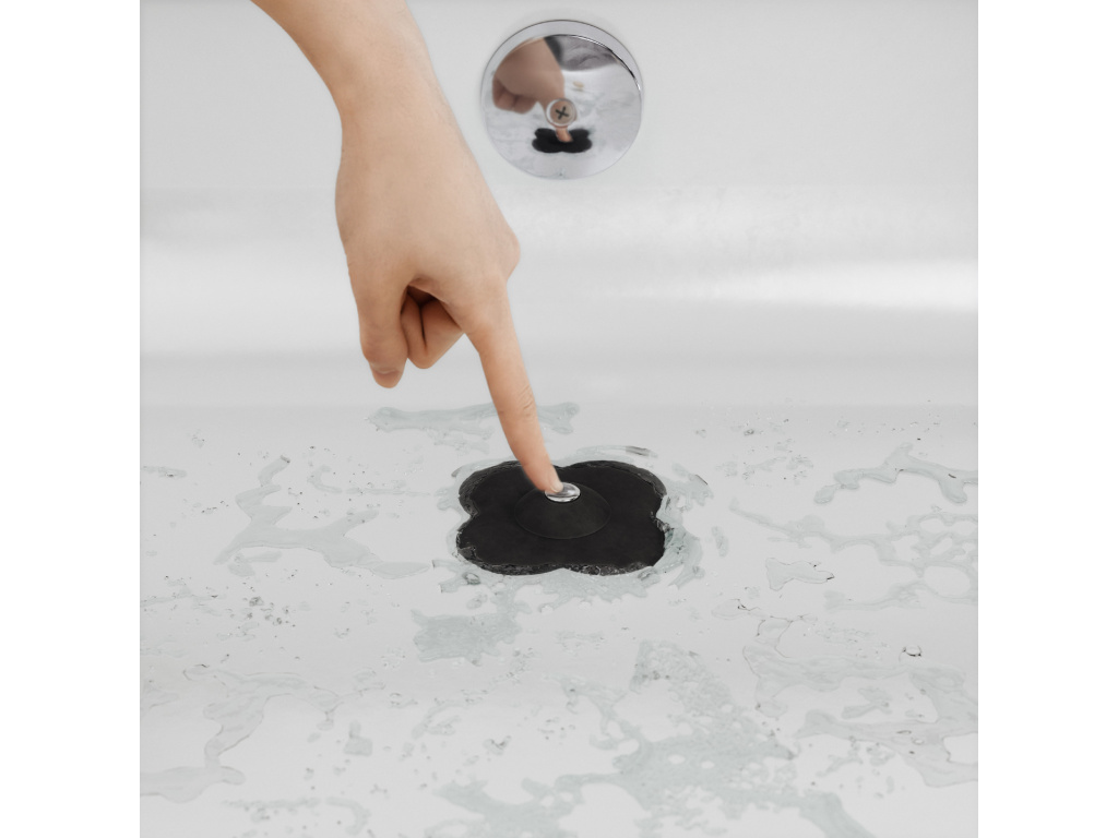 Stiskněte prostřední tlačítko Bloom pro uvolnění toku vody a použijte jej jako lapač vlasů, zatlačte na ohnuté okraje pro uzavření ventilu a použijte jej jako zátku odtoku.