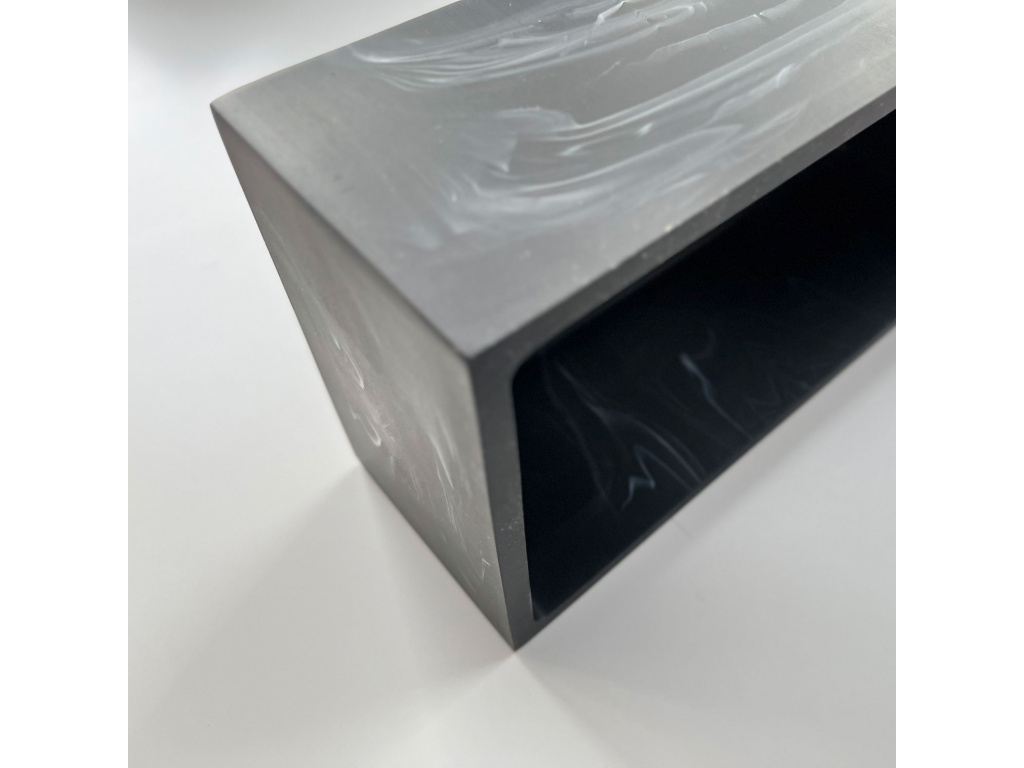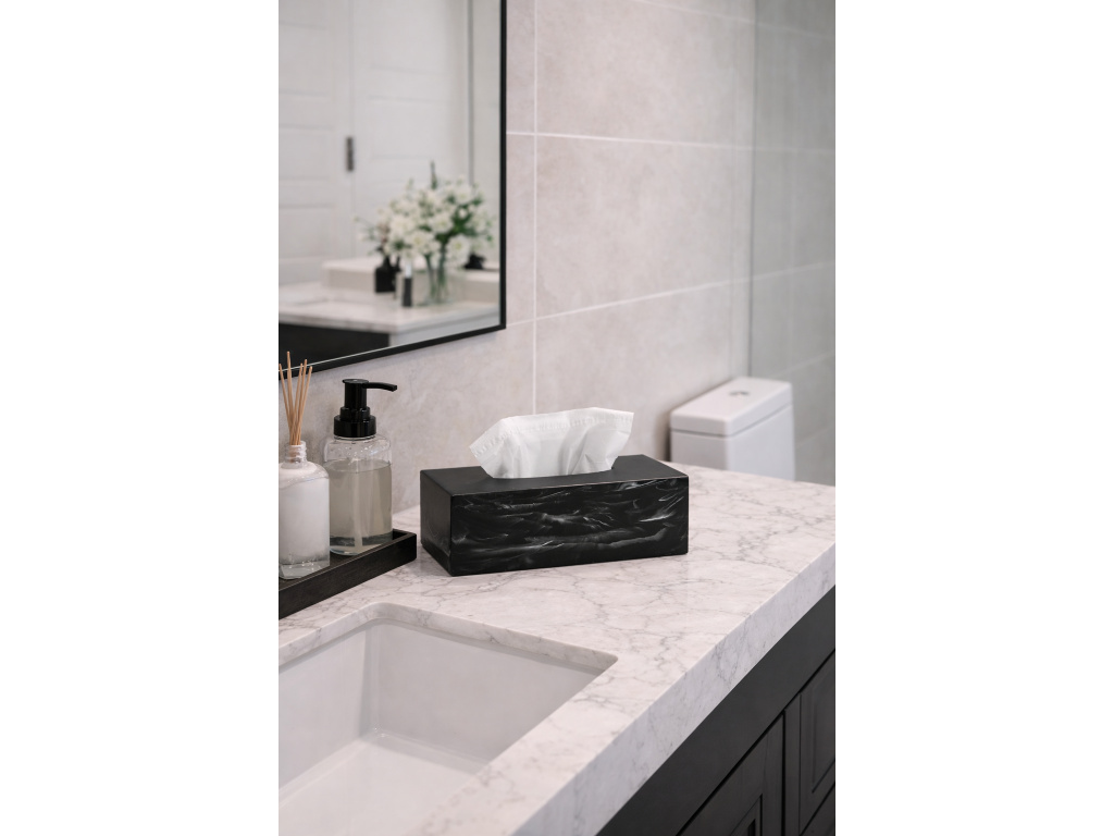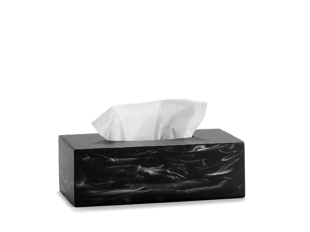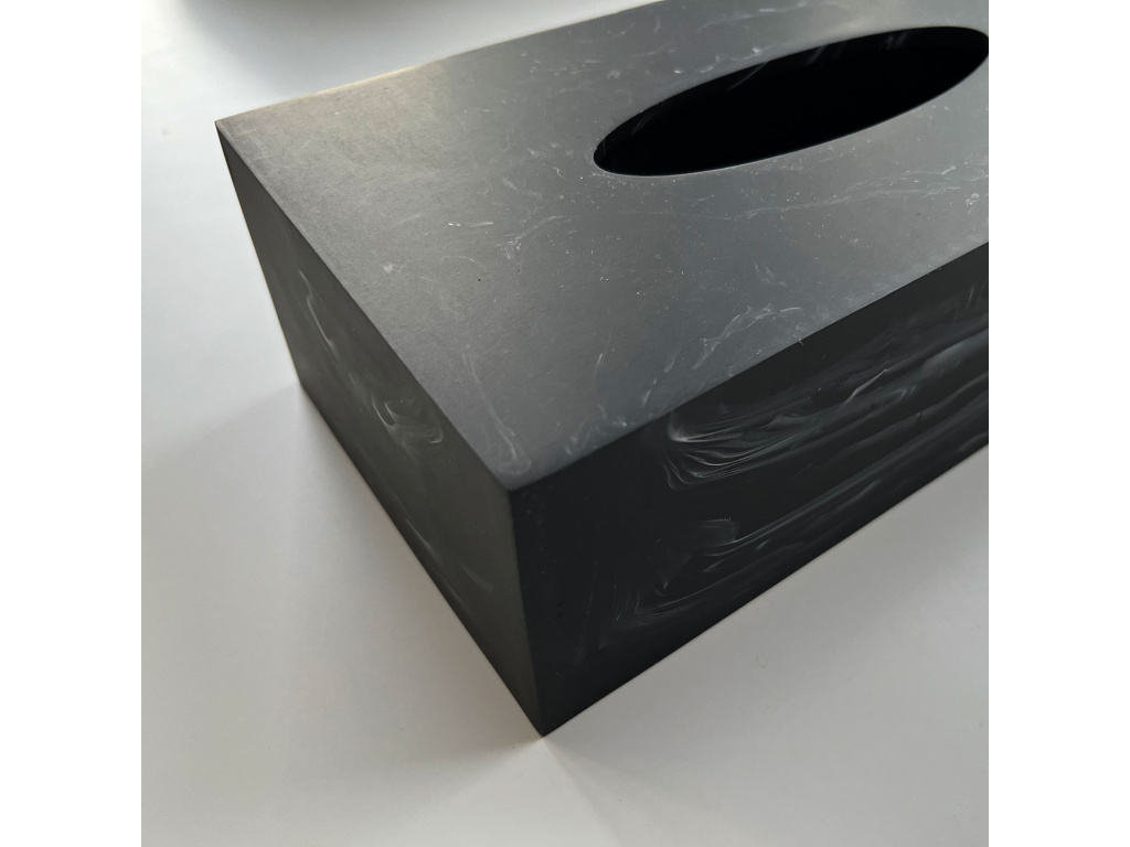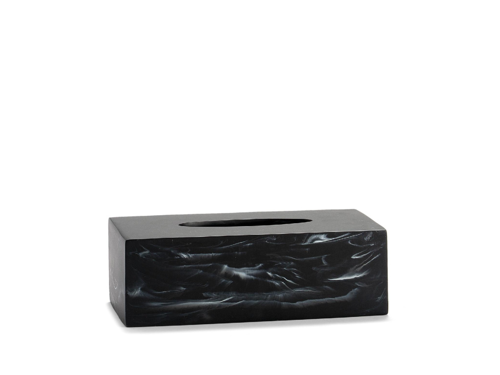 Tento box na kapesníky je vyroben z černého polyresinu s mramorovým efektem a má standardní velikost kartonových krabic na kapesníky, které lze zakoupit v každém supermarketu.