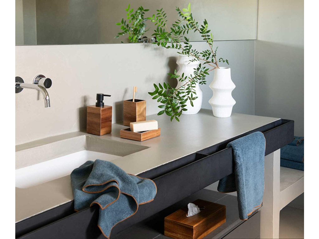 Je součástí dřevěného koupelnového setu s miskou na mýdlo, dávkovačem a kartáčkem.