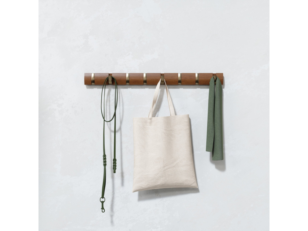 Dřevěný věšák na zeď Umbra Flip 8 háčků | světlá ořechová/matná zlatá