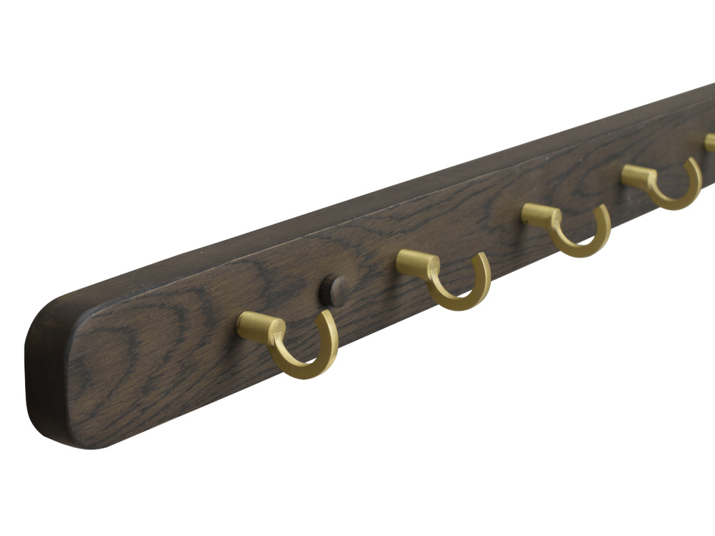 Luxusní design a zlaté detaily Tento věšák spojuje přírodní hnědé dubové dřevo s elegantními zlatými kovovými háčky. Šest pevných háčků poskytuje dostatek prostoru pro zavěšení kabátů, bund a dalších doplňků. Zlaté detaily dodávají interiéru sofistikovaný nádech.