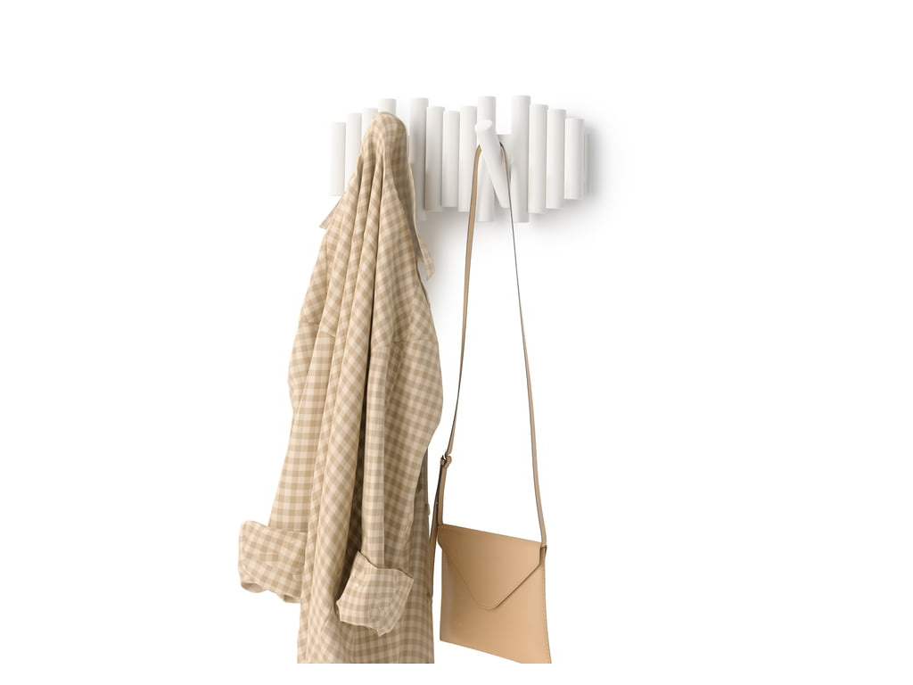 Věšák na stěnu Picket je perfektním řešením, háček si vyklopíte pouze pokud chcete něco pověsit, jinak je sklopený a nezabírá místo.