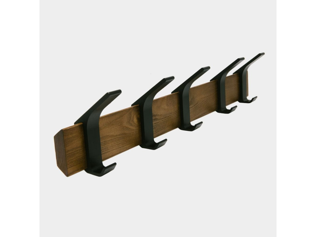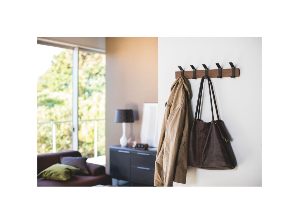S moderním a městským nádechem je tento nástěnný věšák vybaven nastavitelnými kovovými háčky, které se posouvají po dřevěném rámu a umožňují maximální flexibilitu.