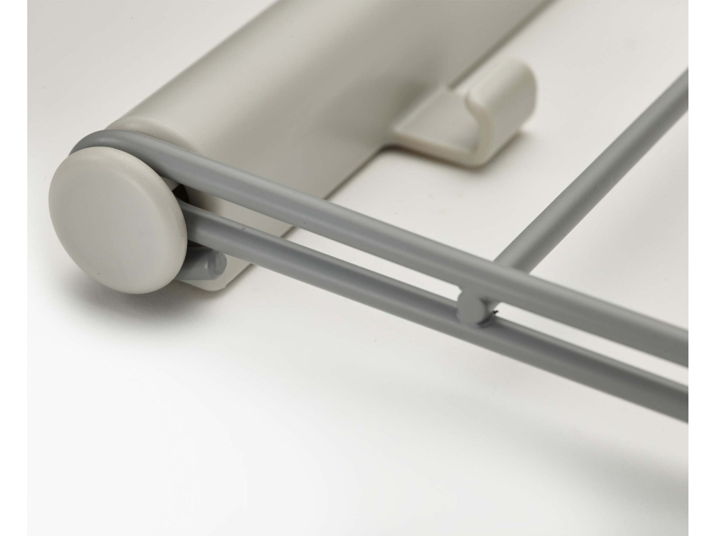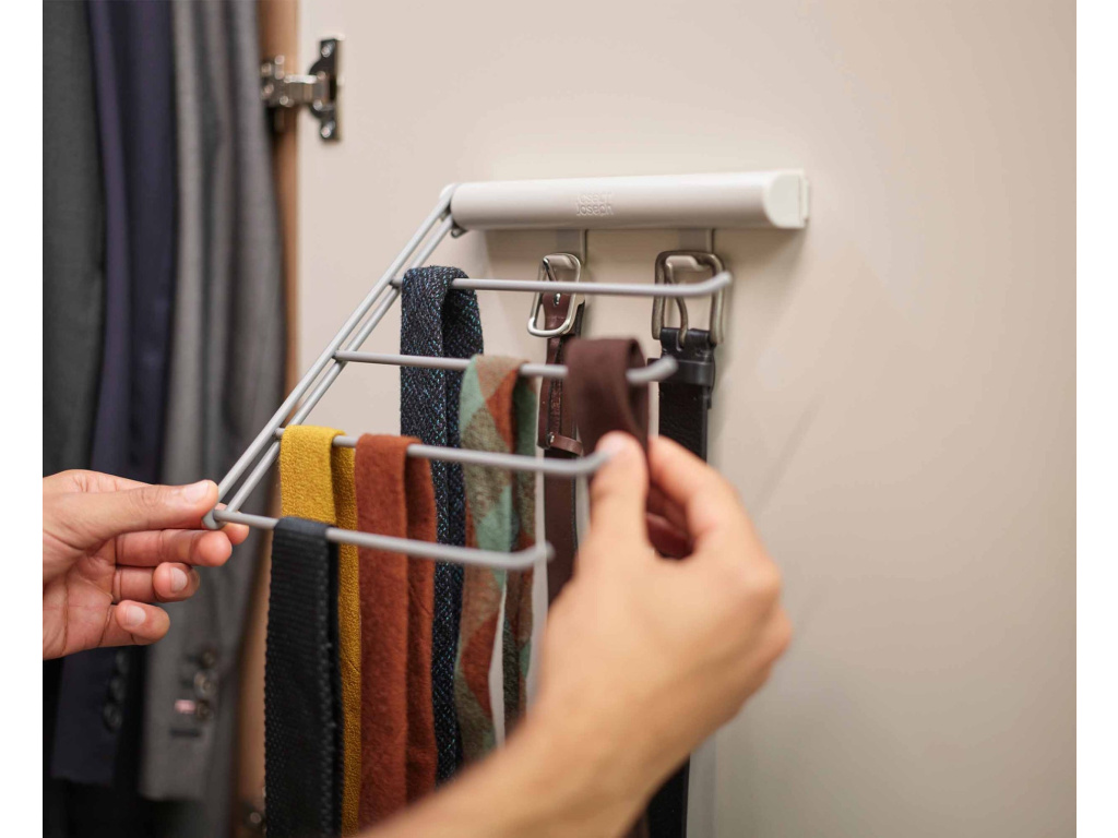Toto úhledné úložné řešení je ideální pro uložení doplňků, jako jsou opasky, kravaty a šátky, které jsou známé tím, že se snadno ztratí v zásuvkách a šatních skříních. Tento chytrý design, který je ideální pro montáž do šatních skříní, přiléhá naplocho k montážnímu povrchu, aby se ušetřilo místo, a má kolejničky, které lze zvednout a uložené předměty snadno vyjmout.