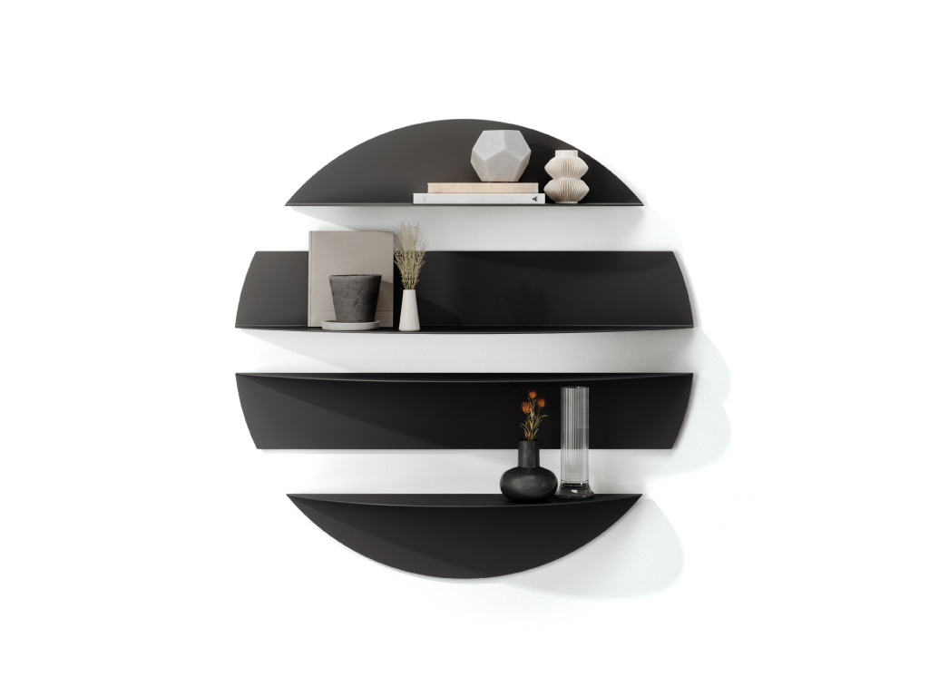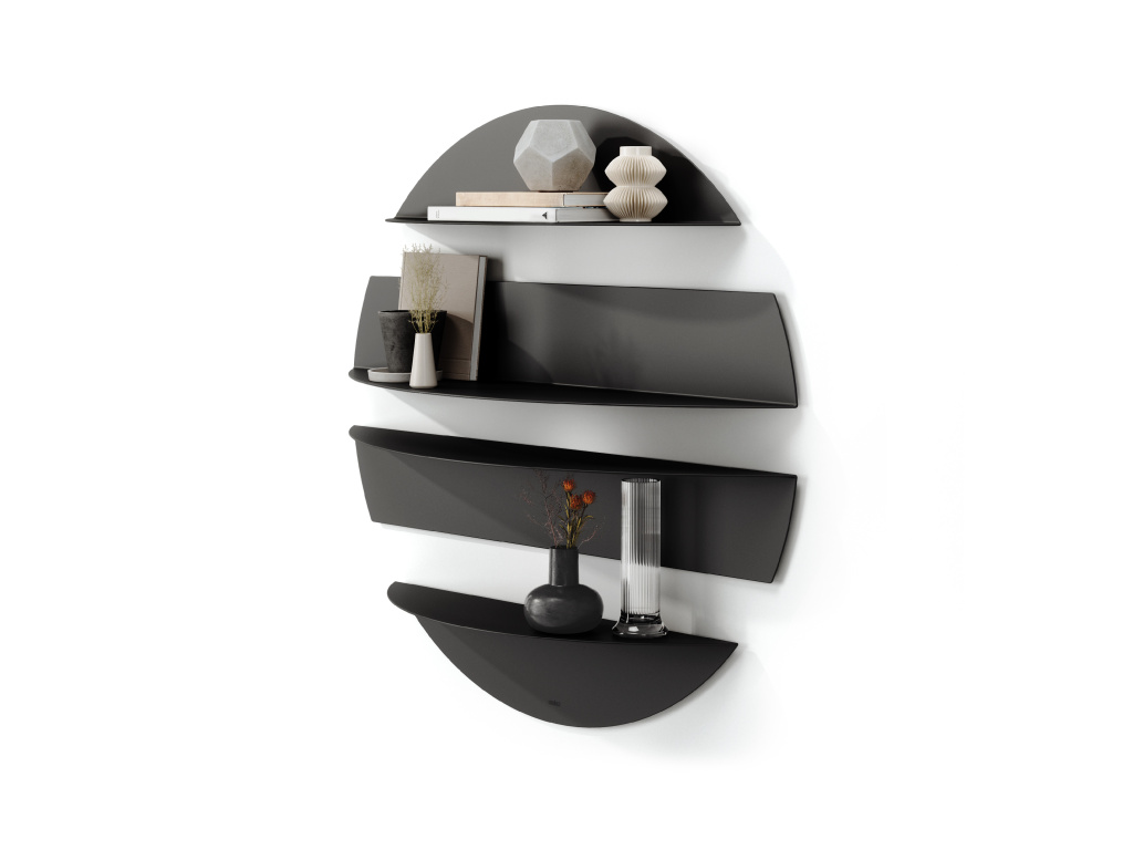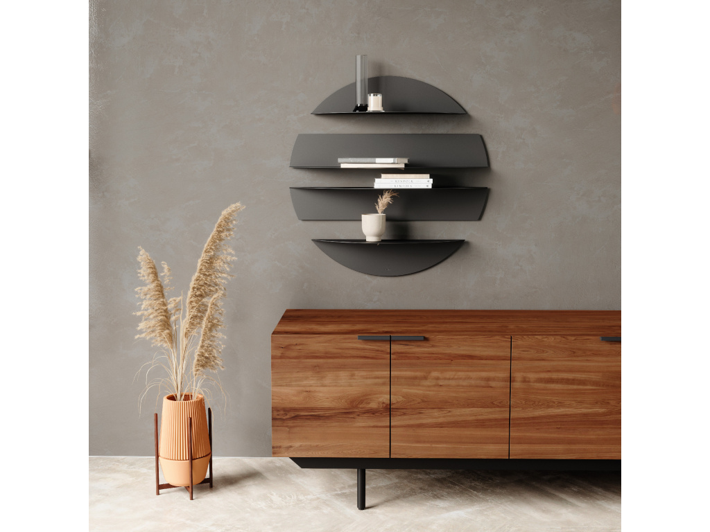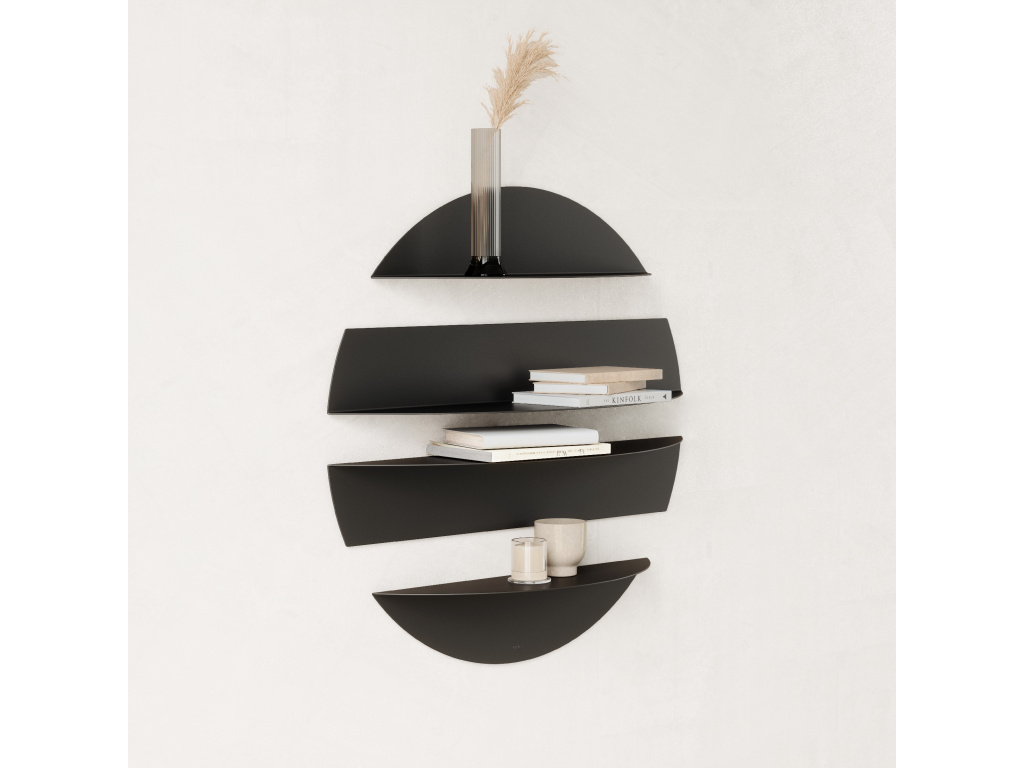 Tento set čtyř nástěnných polic z ohýbaného kovu nabízí moderní design a praktické úložné řešení.