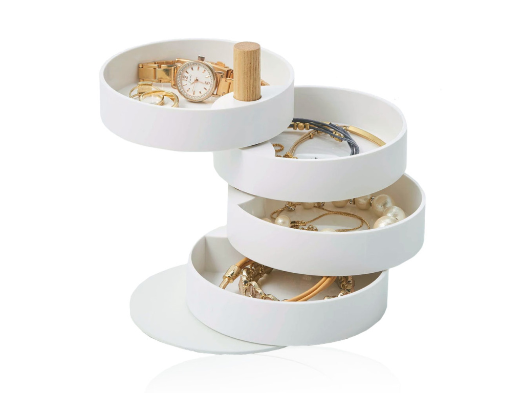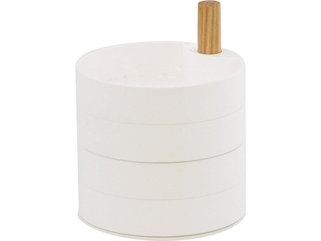Tento jednoduchý designový box na šperky má 4 pohyblivé misky na uložení šperků a jiných doplňků.