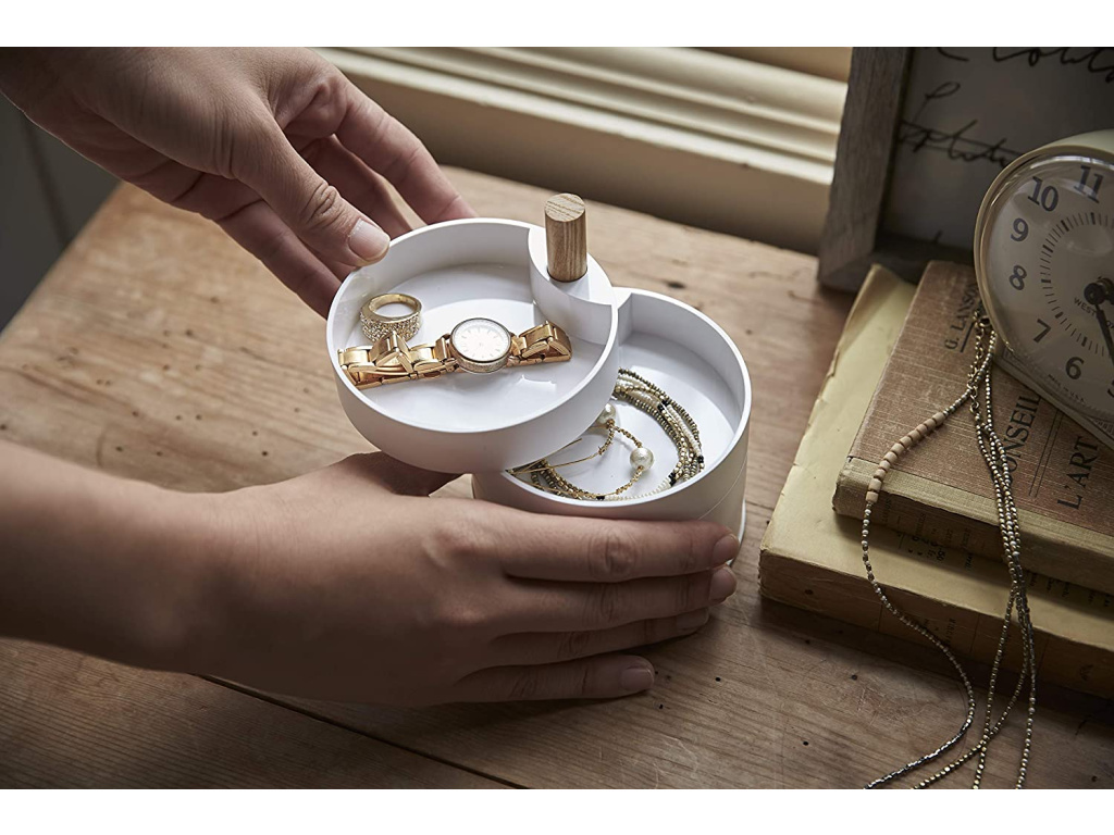 Plastové misky na šperky otočné kolem dřevěného stojánku s kovovou základnou.