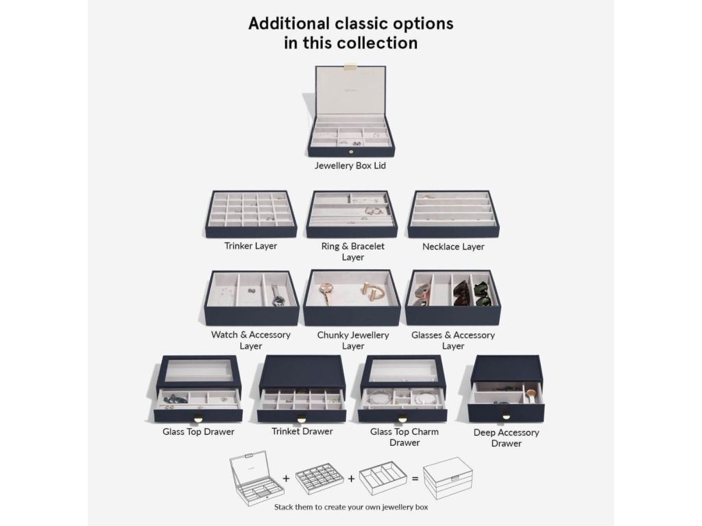 Šperkovnice Stackers jsou navrženy tak, abyste si mohli vytvořit své vlastní šperkovnice výběrem vrstev a doplňků, které nejlépe vyhovují vaší jedinečné kolekci šperků.