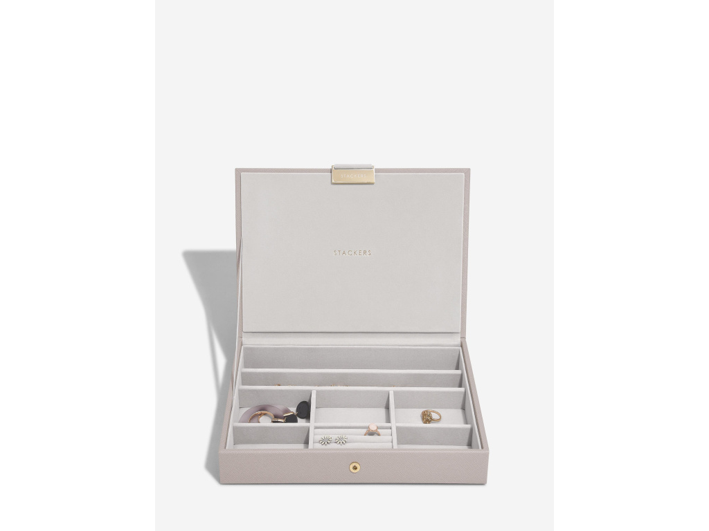 Modulární systém Stackers umožňuje vytvořit šperkovnici přesně podle vaší sbírky. Toto víko má univerzální přihrádky pro drobné šperky a měkké sametové polstrování, které šperky chrání před poškrábáním. Jak vaše kolekce poroste, jednoduše přidáte další patra v rozměru Classic a poskládáte si vlastní set.