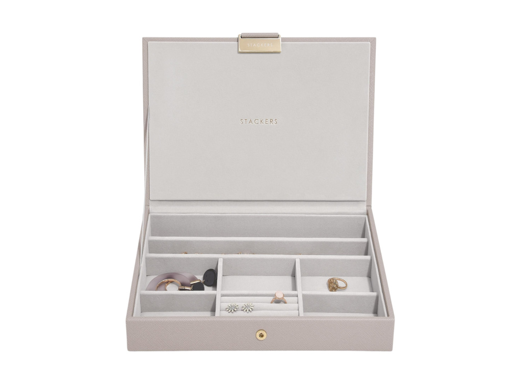 Elegantní víko pro šperkovnici Stackers v rozměru Classic. Ideální jako startovní díl nebo samostatně na toaletním stolku – udrží prsteny, náušnice, náramky i náhrdelníky přehledně a bez zamotání.