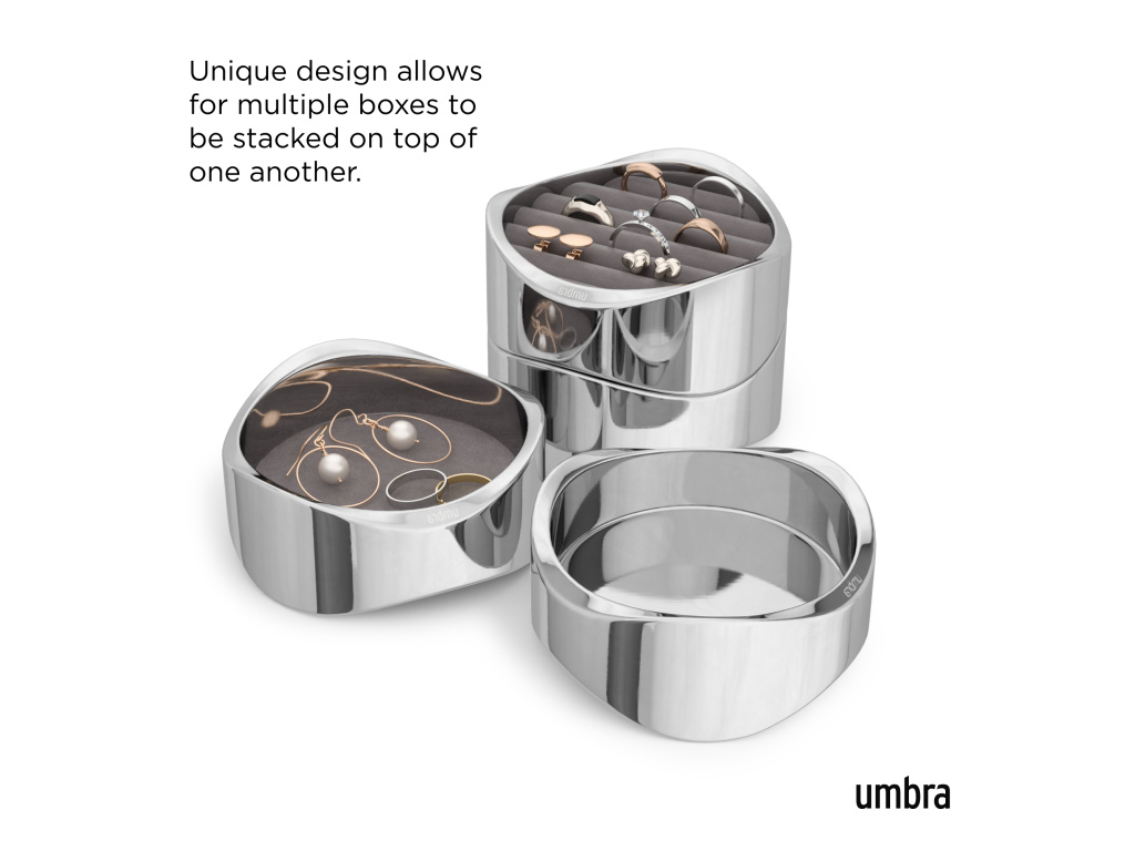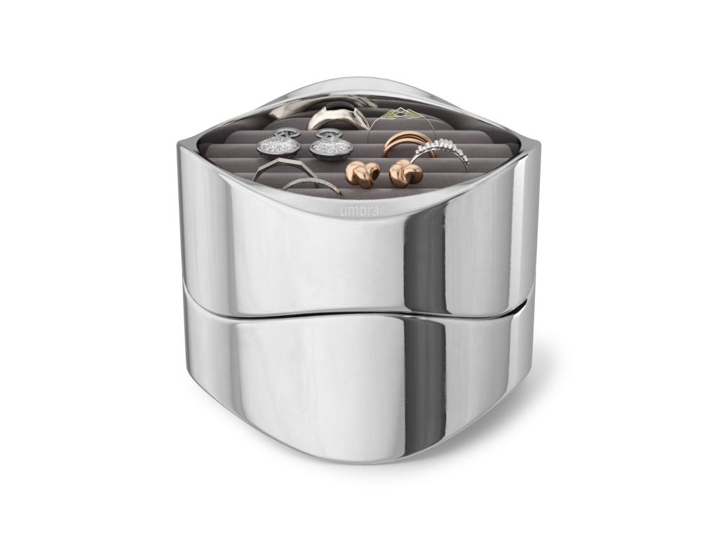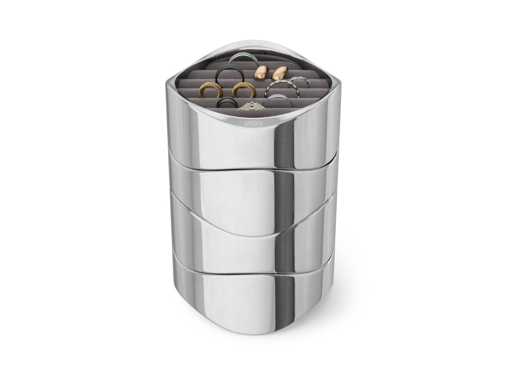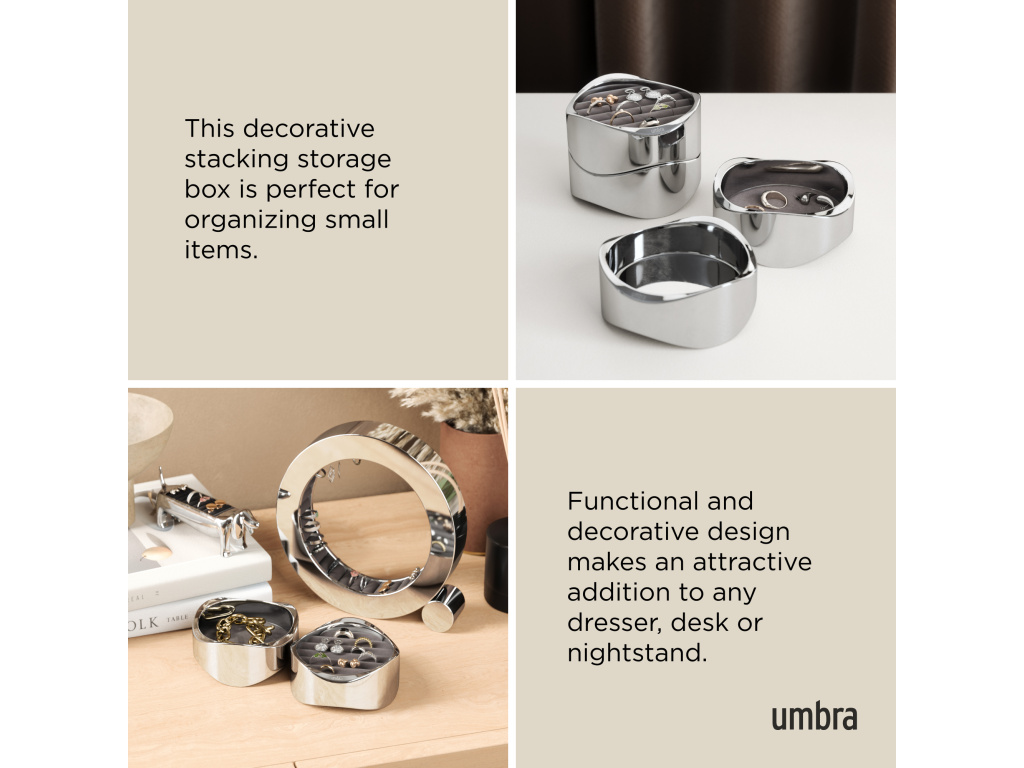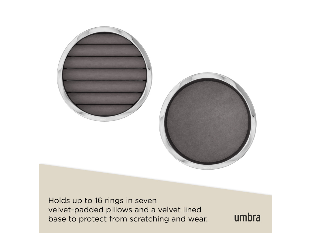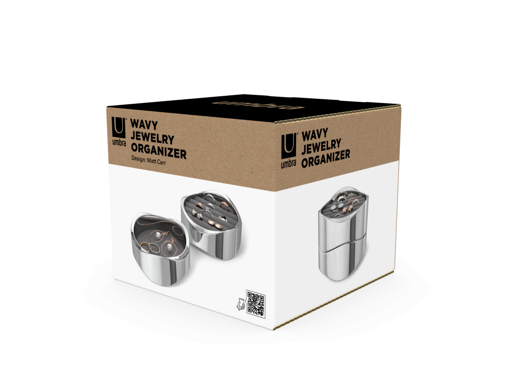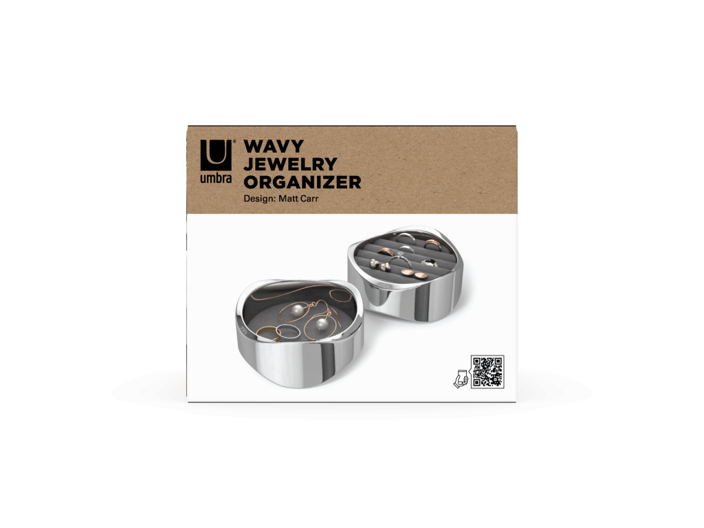 Představujeme organizér na šperky Wavy od Umbry – elegantní design se setkává s funkční elegancí. Díky lesklému leštěnému chromu dodá Wavy vašemu toaletnímu stolku sofistikovaný nádech a zároveň udrží vaše cenné kousky uspořádané a chráněné. Wavy je vyroben s důrazem na detail a disponuje měkkou, polstrovanou sametovou základnou, která chrání vaše náušnice, prsteny, náramky a doplňky před poškrábáním a opotřebením.