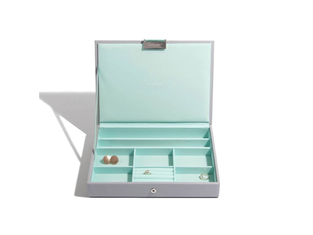 Šperkovnice Stackers Grey Mint Classic Lid je vyrobena z měkké veganské kůže s kvalitní bavlněnou podšívkou.