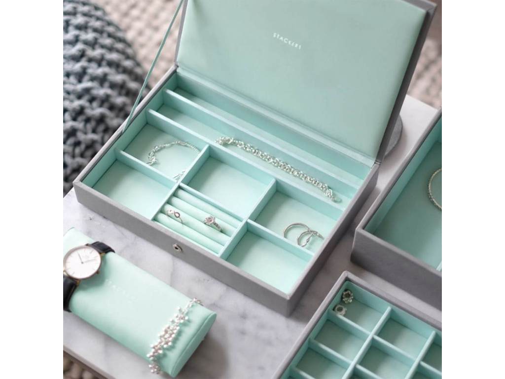 TIP: Šperkovnice Stackers je k dispozici v tyrkysové, růžové, šedobéžové, skleněné, tmavě modré, bílé, modrošedé, černé, šedé, zelené, levandulové a kávové barvě.
