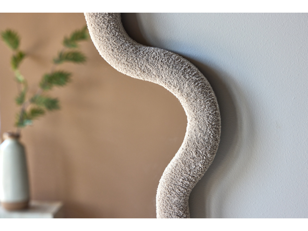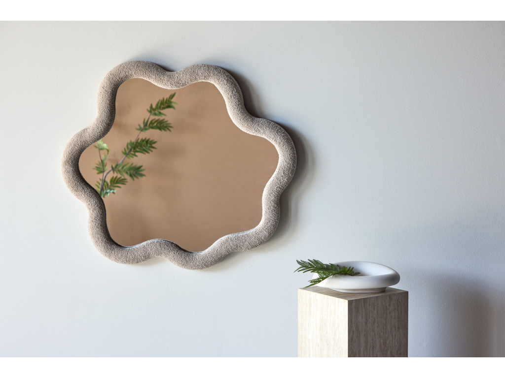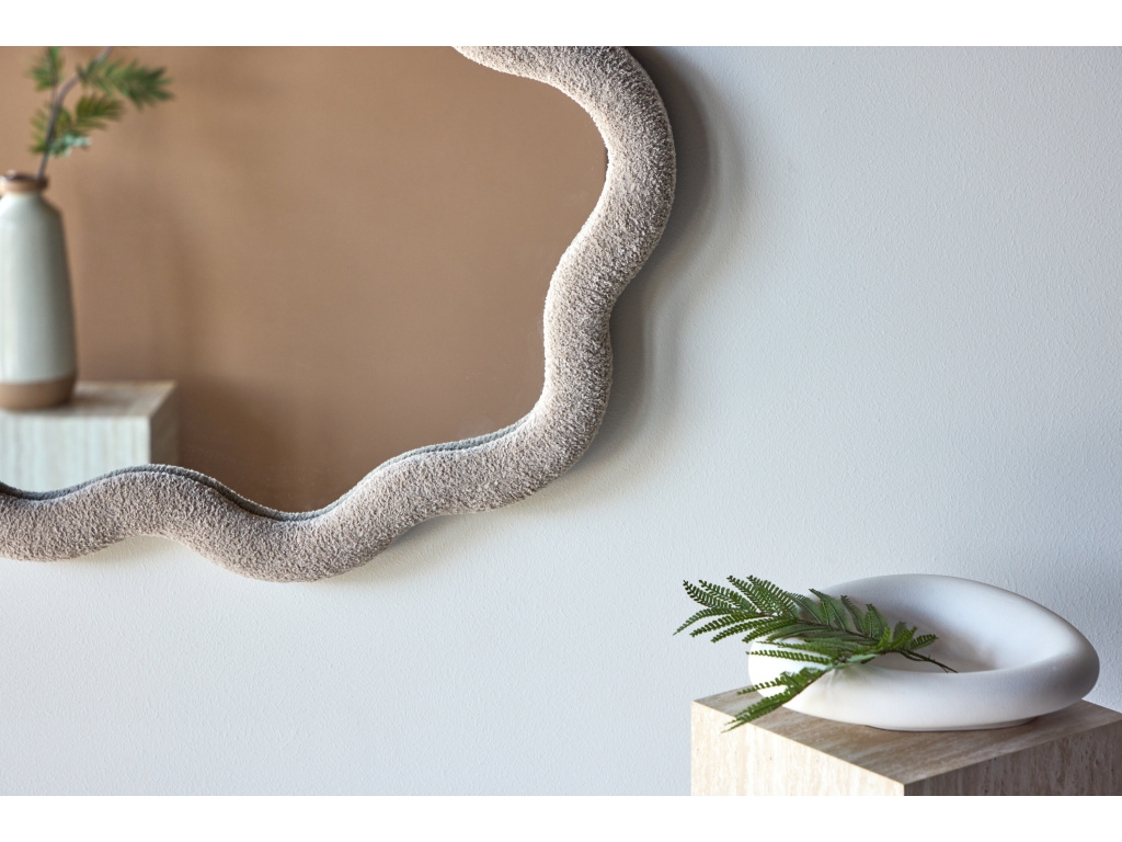 Dovolte nám představit Kungsbacka – zrcadlo, které se odváží vyniknout svým hravým, vlnitým tvarem a jemným výrazem. Díky zaobleným liniím vytváří harmonický pocit a dodává okouzlující klid jak chodbě, tak i místnosti, ve které je umístěno. Velkorysné rozměry 70x70 cm dělají z Kungsbacky dekorativní prvek, který zároveň slouží jako praktický prvek v každodenním životě. Rám je potažen béžovou látkou buklé, jejíž textura umocňuje příjemný a moderní charakter zrcadla.