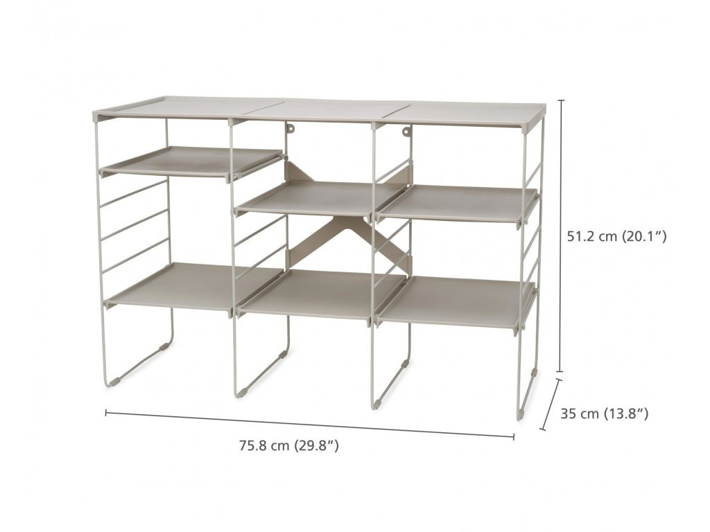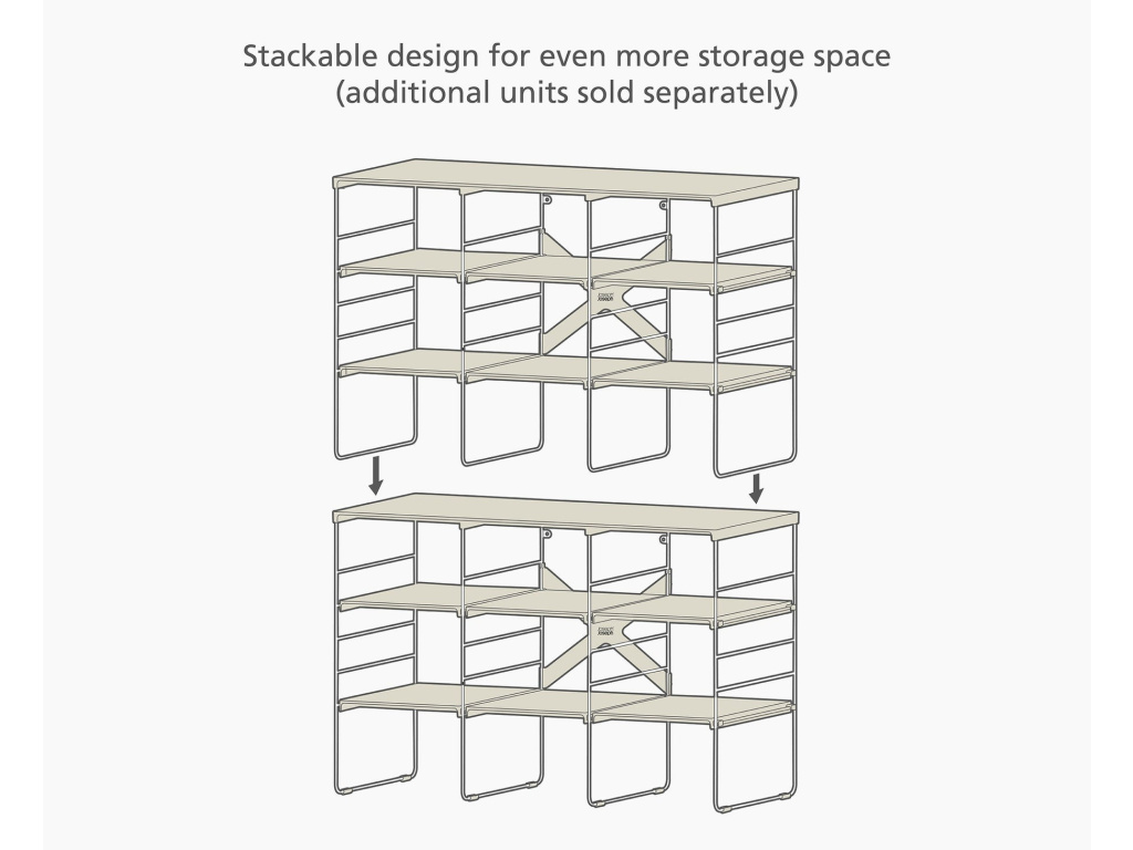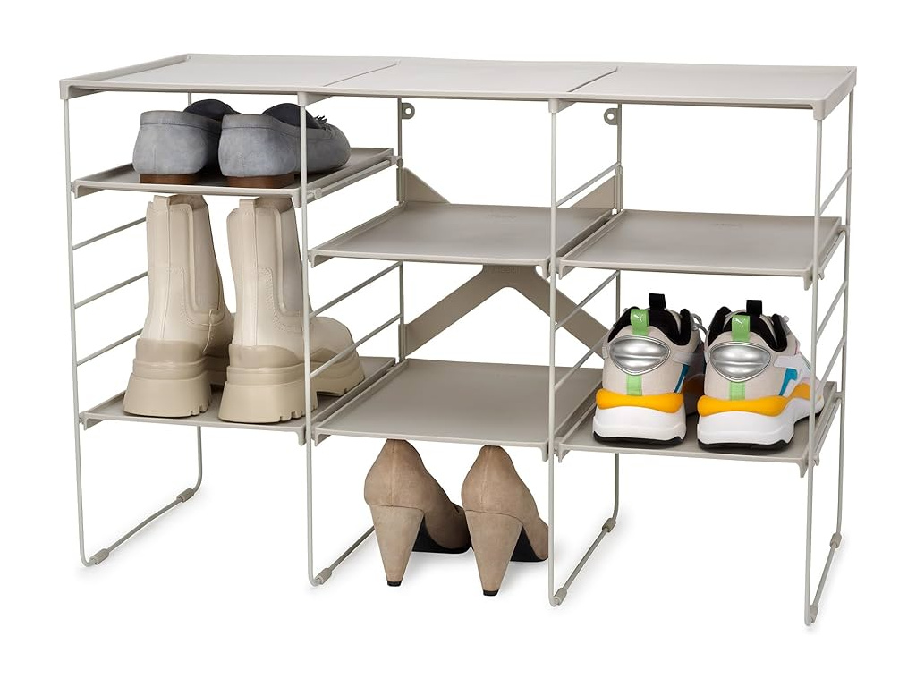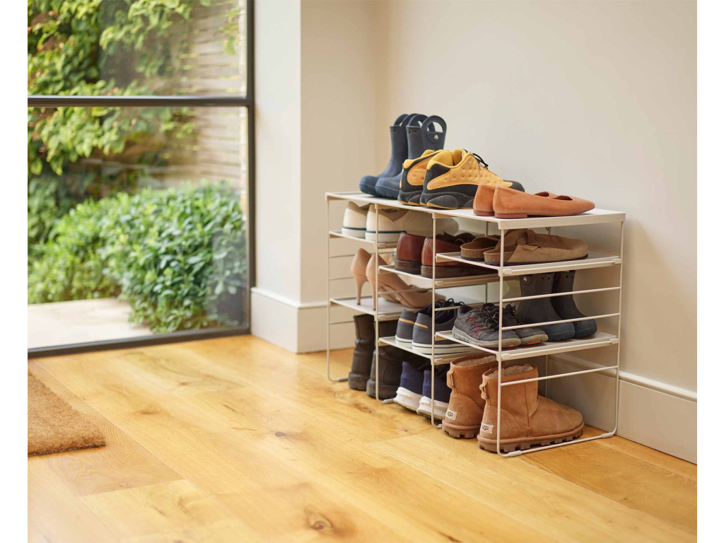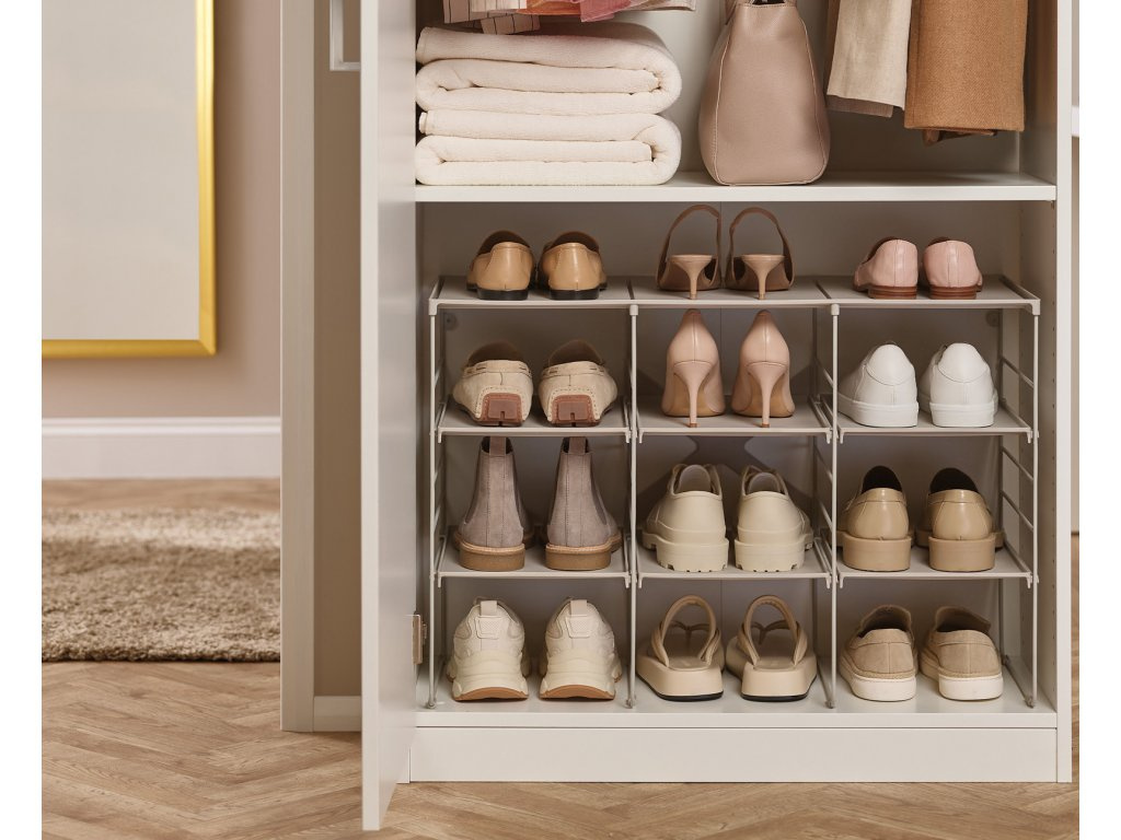 Boty, boty, tenisky – ať už je váš styl jakýkoli, jednoduše si je upravte tak, aby odpovídaly vaší kolekci. Poličky se opravdu snadno sestavují, připevňují se k pevnému ocelovému rámu, zatímco další regály lze stohovat na sebe a přišroubovat ke stěně pro větší stabilitu. Tento větší design pojme až dvanáct párů bot.