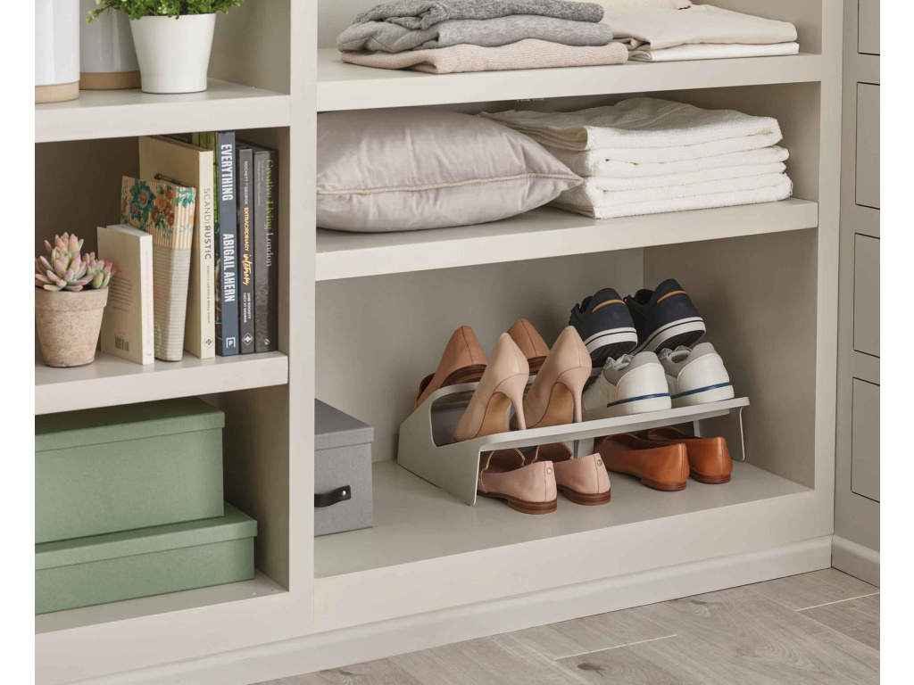 Tento kompaktní stojan, ideální do skříní, šaten nebo předsíní, úhledně pojme šest párů bot nebo holínek na menším prostoru.