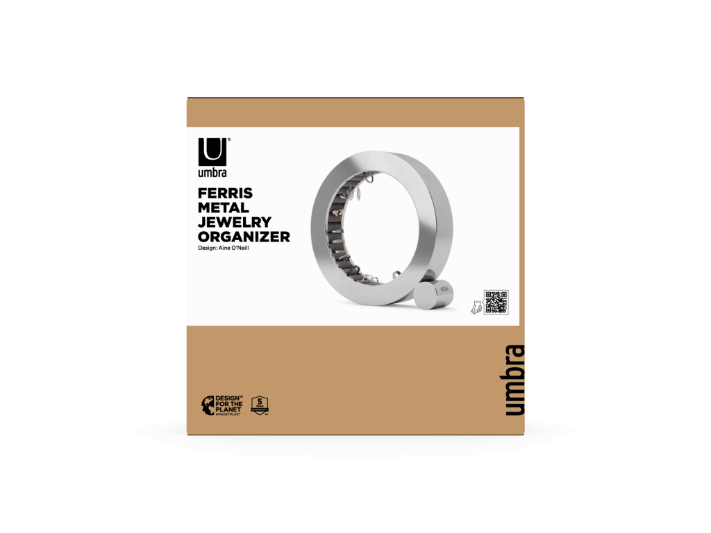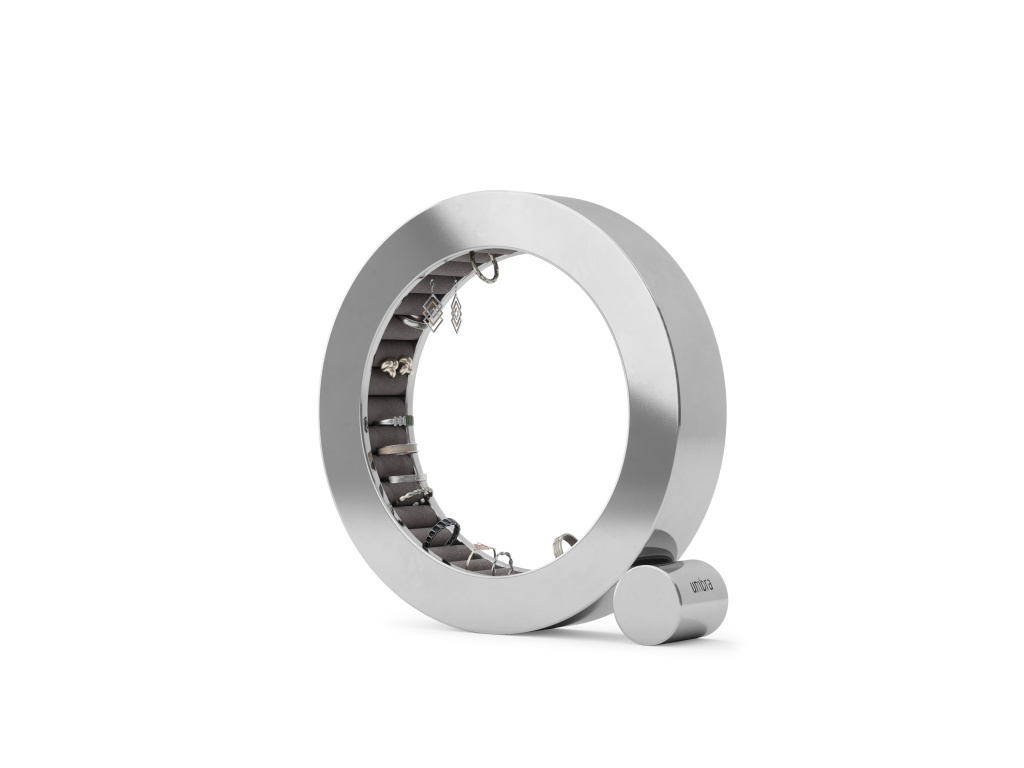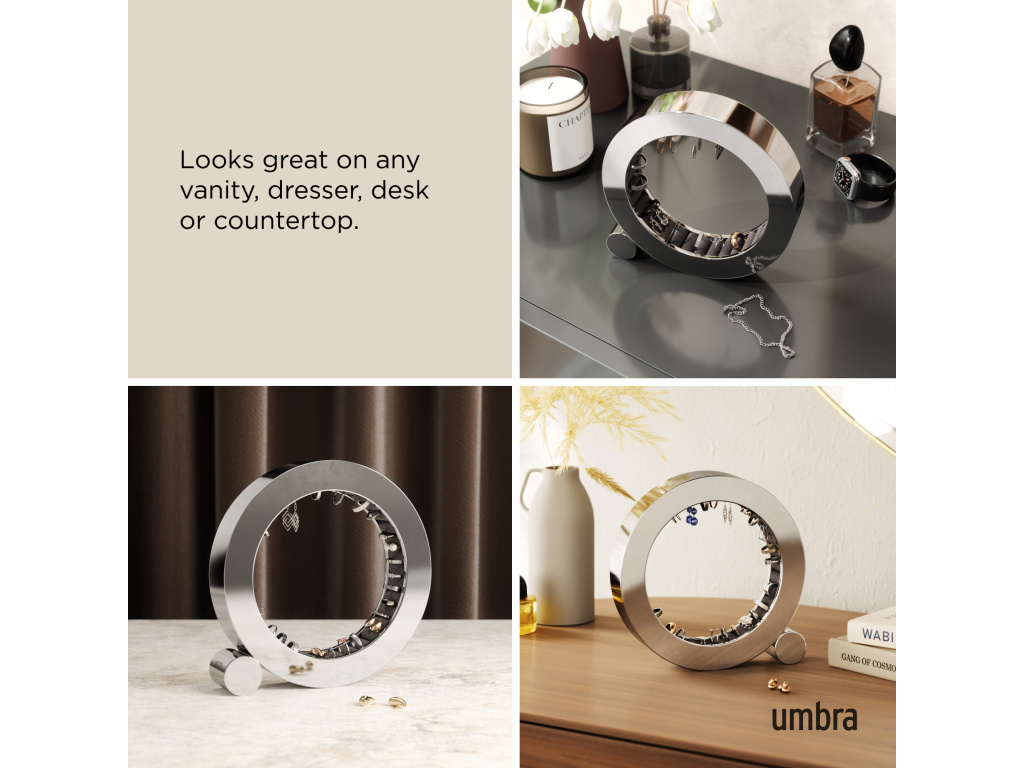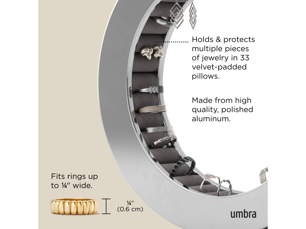 Udělejte si dojem s organizérem na šperky Umbra FERRIS, nyní v elegantním provedení s leštěným hliníkem. Je navržen tak, aby bezpečně držel a chránil vaše prsteny, jeho sametové polštářky dodávají nádech luxusu a zároveň chrání vaše šperky. Leštěný hliník je ošetřen speciální vrstvou odolnou proti otiskům prstů, takže vypadá perfektně a stylově, ať už je umístěn kdekoli – na nočním stolku, komodě nebo na stole.
