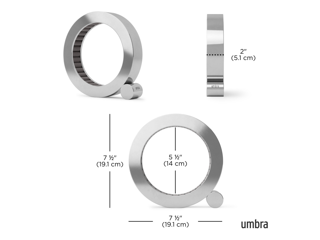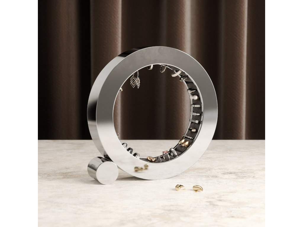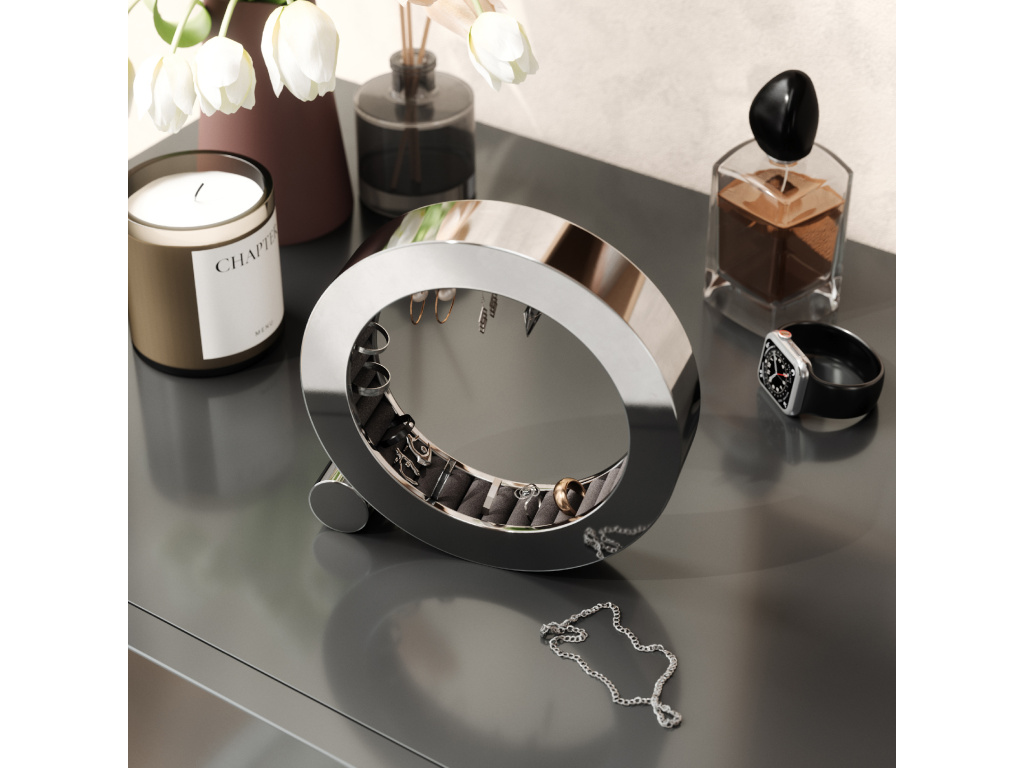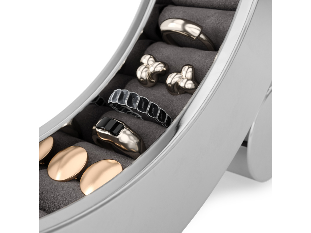 Udělejte si dojem s organizérem na šperky Umbra FERRIS, nyní v elegantním provedení s leštěným hliníkem. Je navržen tak, aby bezpečně držel a chránil vaše prsteny, jeho sametové polštářky dodávají nádech luxusu a zároveň chrání vaše šperky. Leštěný hliník je ošetřen speciální vrstvou odolnou proti otiskům prstů, takže vypadá perfektně a stylově, ať už je umístěn kdekoli – na nočním stolku, komodě nebo na stole.