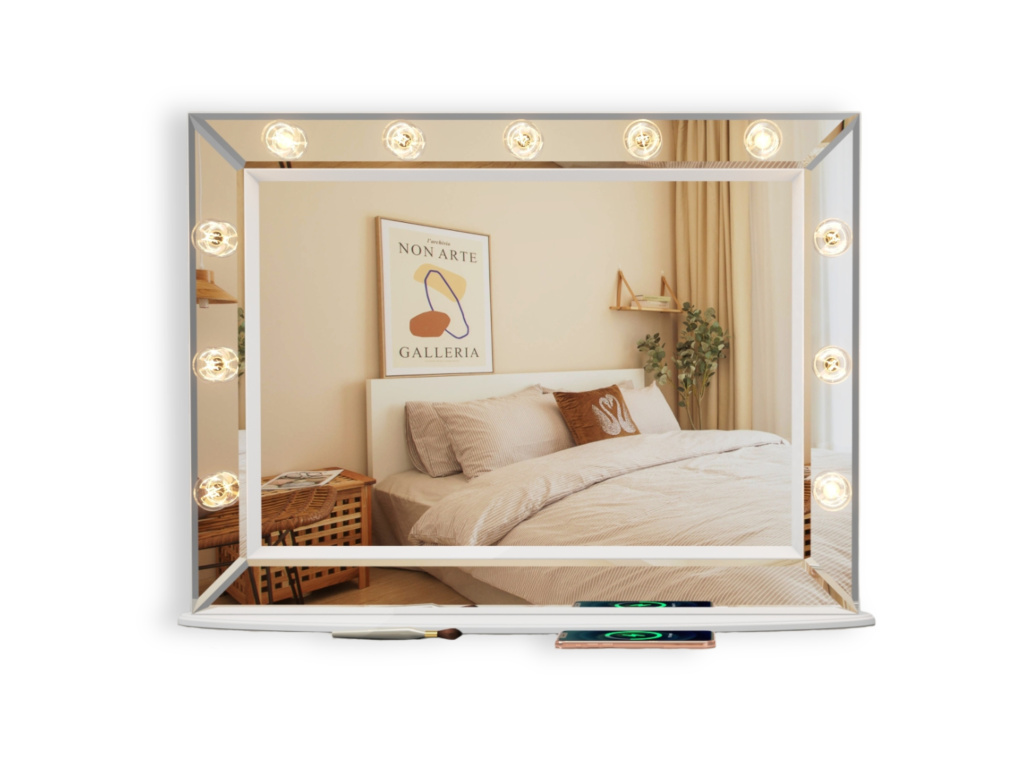 Toto velké kosmetické zrcadlo spojuje skleněný přední rám, pevný hliníkový rám a speciální Uss LED žárovky, které dohromady vytvářejí elegantní a luxusní vzhled. Každý detail byl pečlivě navržen tak, aby přinesl sofistikovanost a dokonalé osvětlení do vašeho beauty koutku.