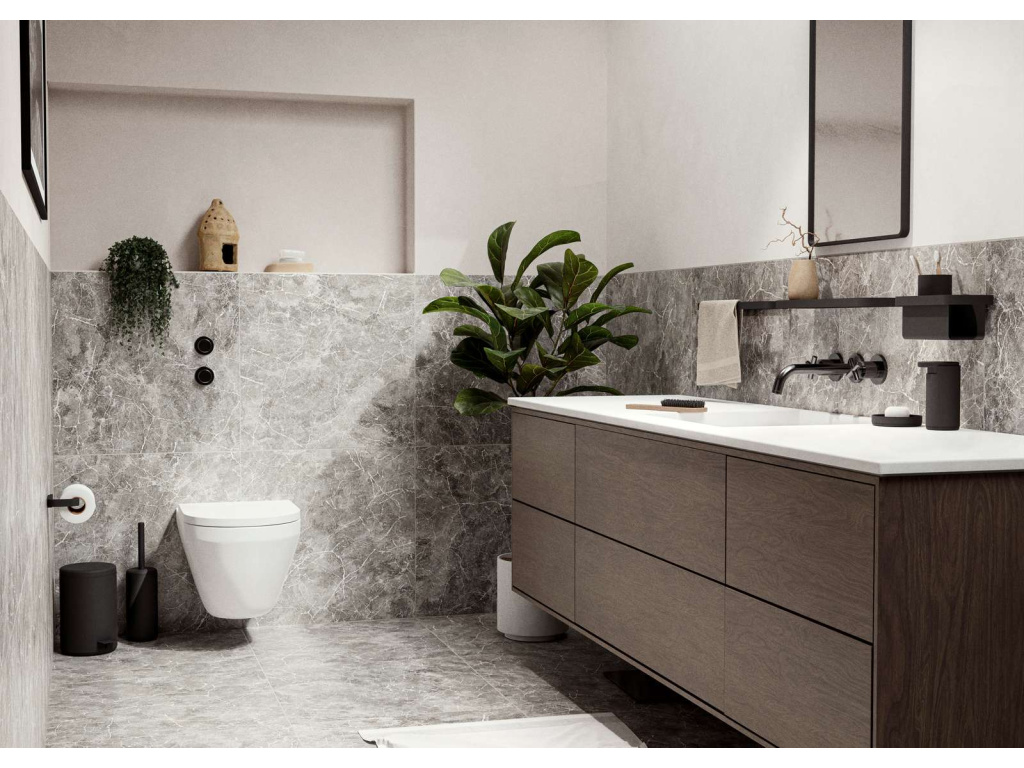 Produkty řady jsou k dispozici v černé a bílé barvě a jsou vyrobeny z robustního hliníku s práškovým nástřikem a samozřejmě se snadno čistí. Několik z nich lze namontovat na stěnu, takže se snadno používají, podporuje to hygienu i estetiku.