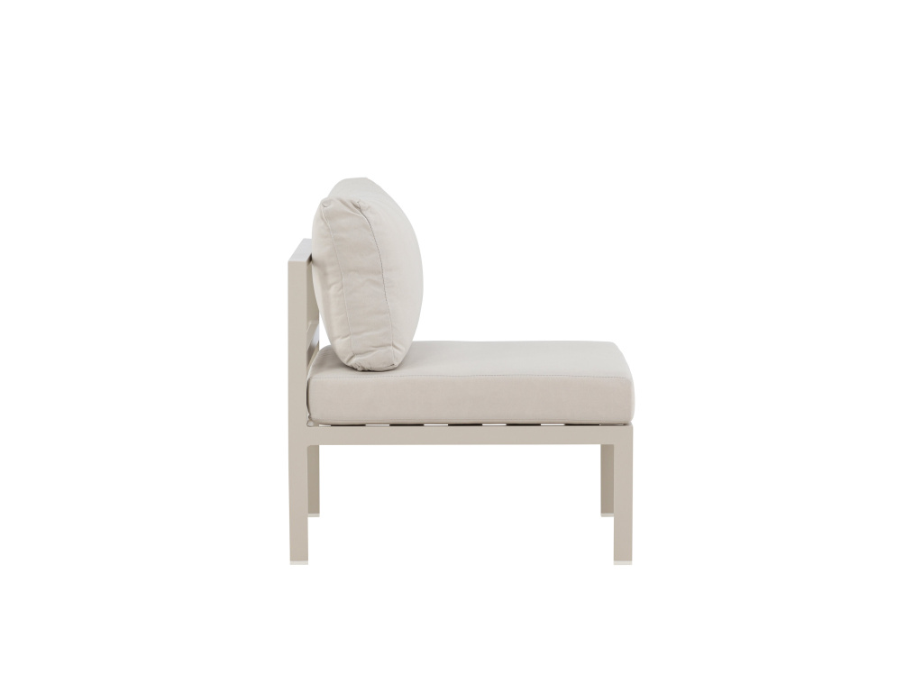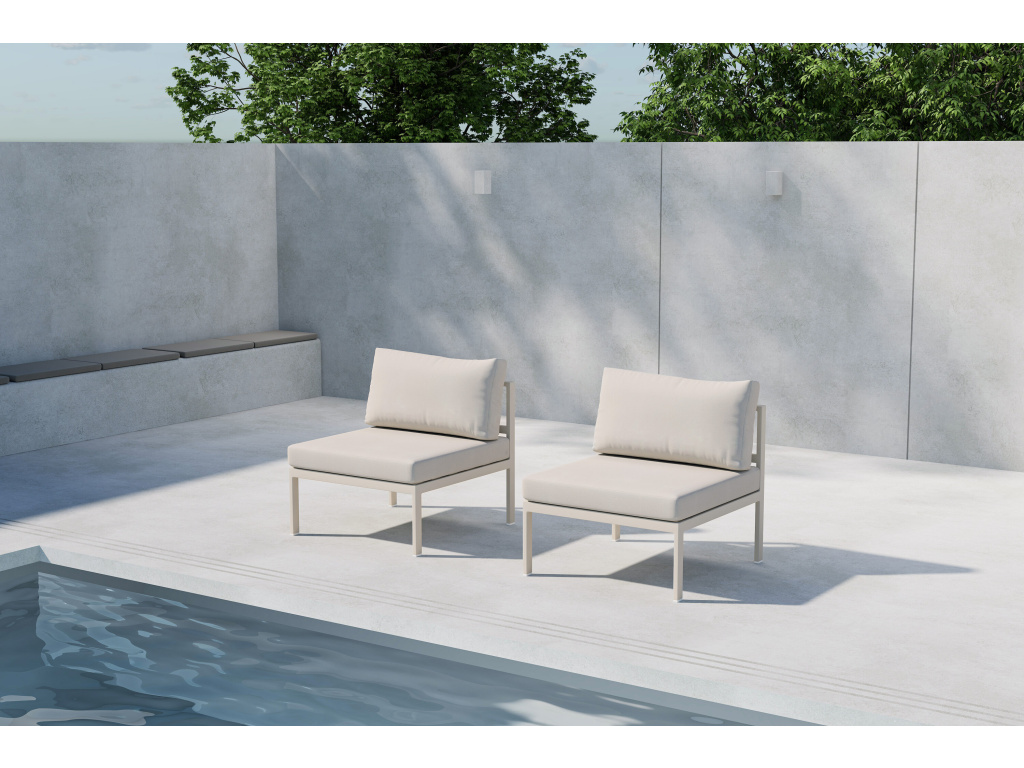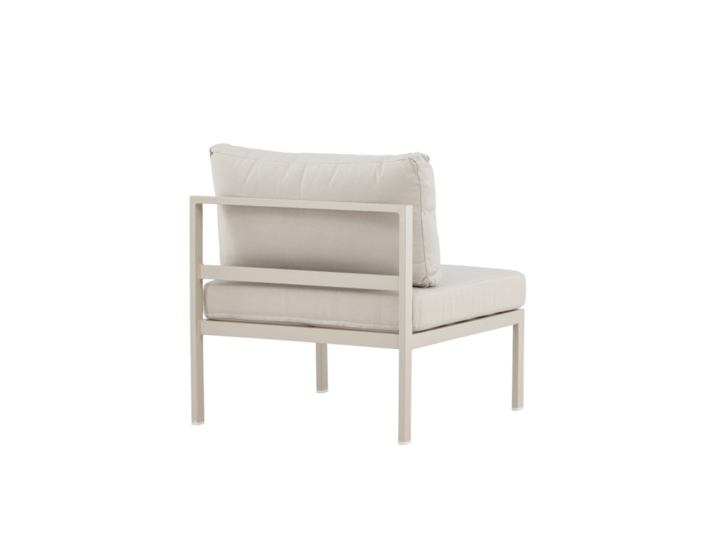 Polštáře jsou vyrobeny z olefinu, trvanlivé tkaniny odolné vůči povětrnostním vlivům, a mají stejný harmonický béžový odstín, který vytváří soudržný a příjemný vzhled.