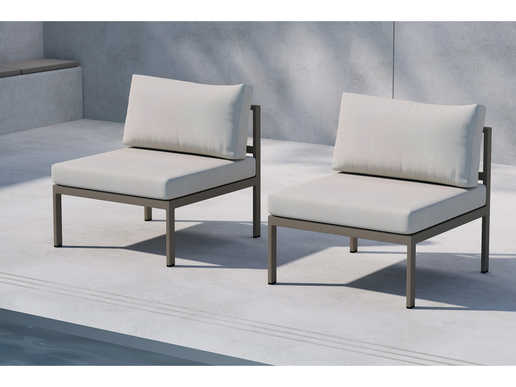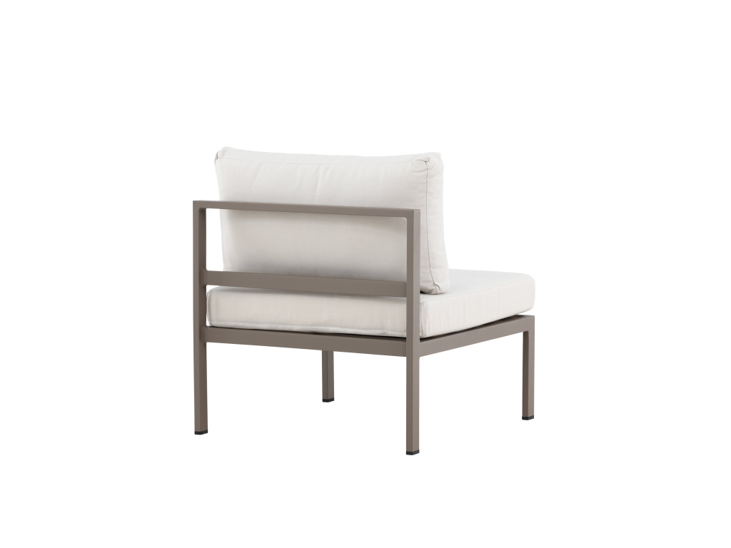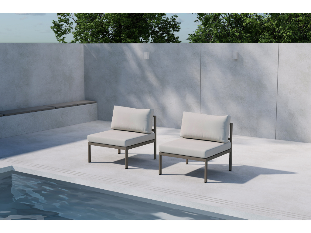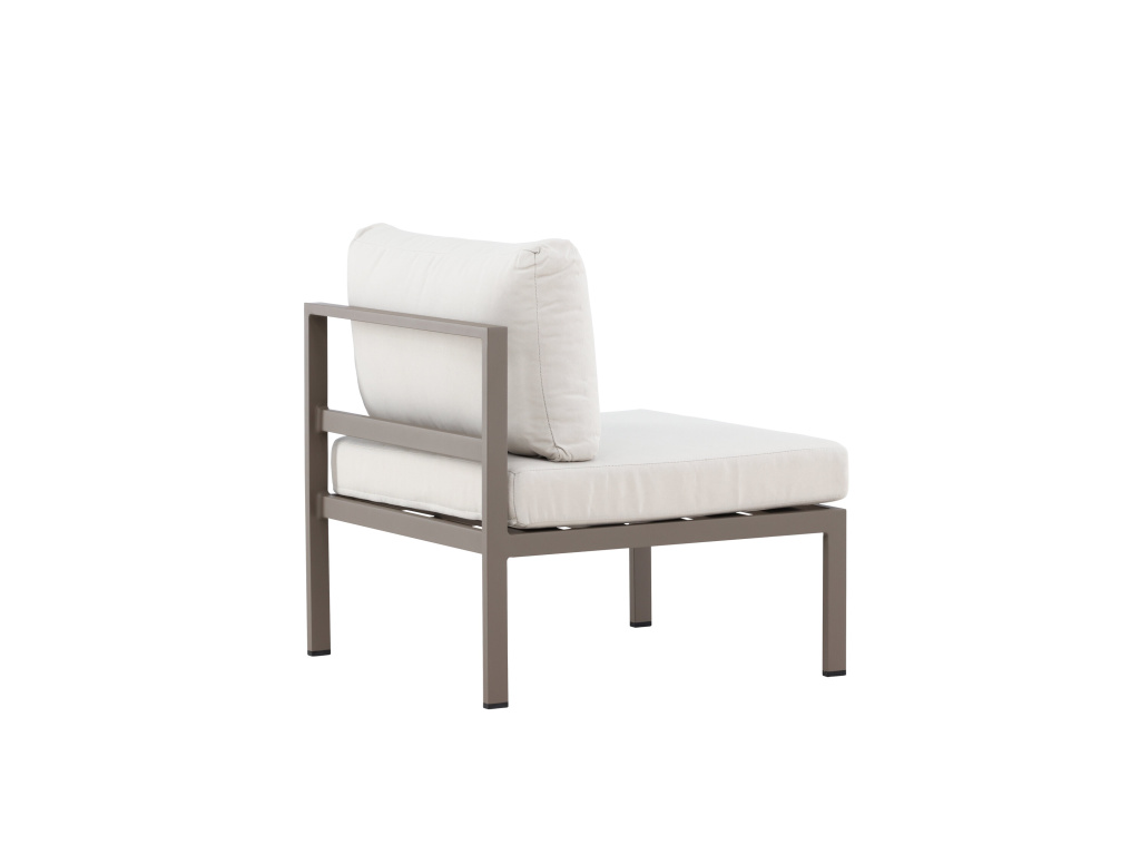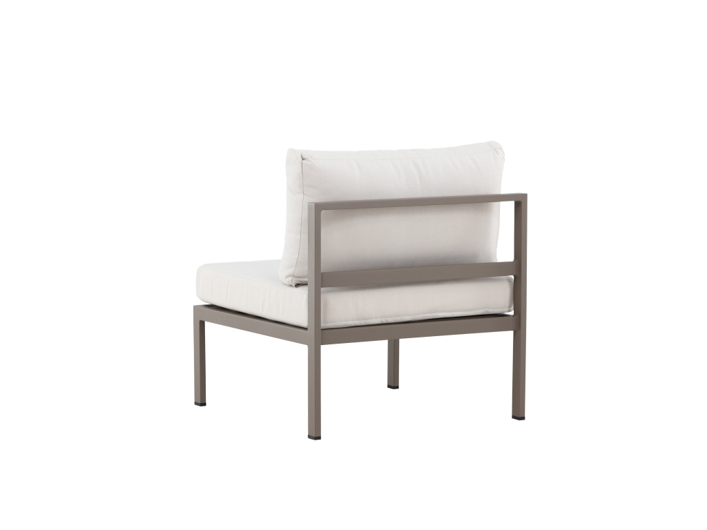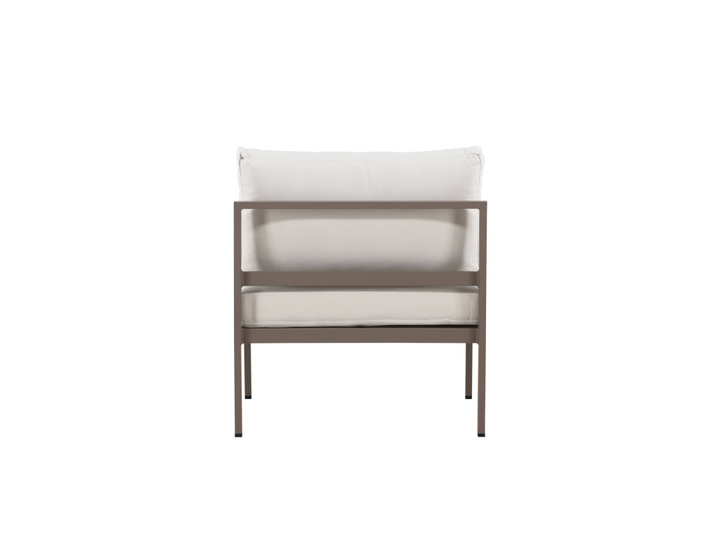 Polštáře jsou vyrobeny z olefinu, trvanlivé tkaniny odolné vůči povětrnostním vlivům, a mají stejný harmonický béžový odstín, který vytváří soudržný a příjemný vzhled.