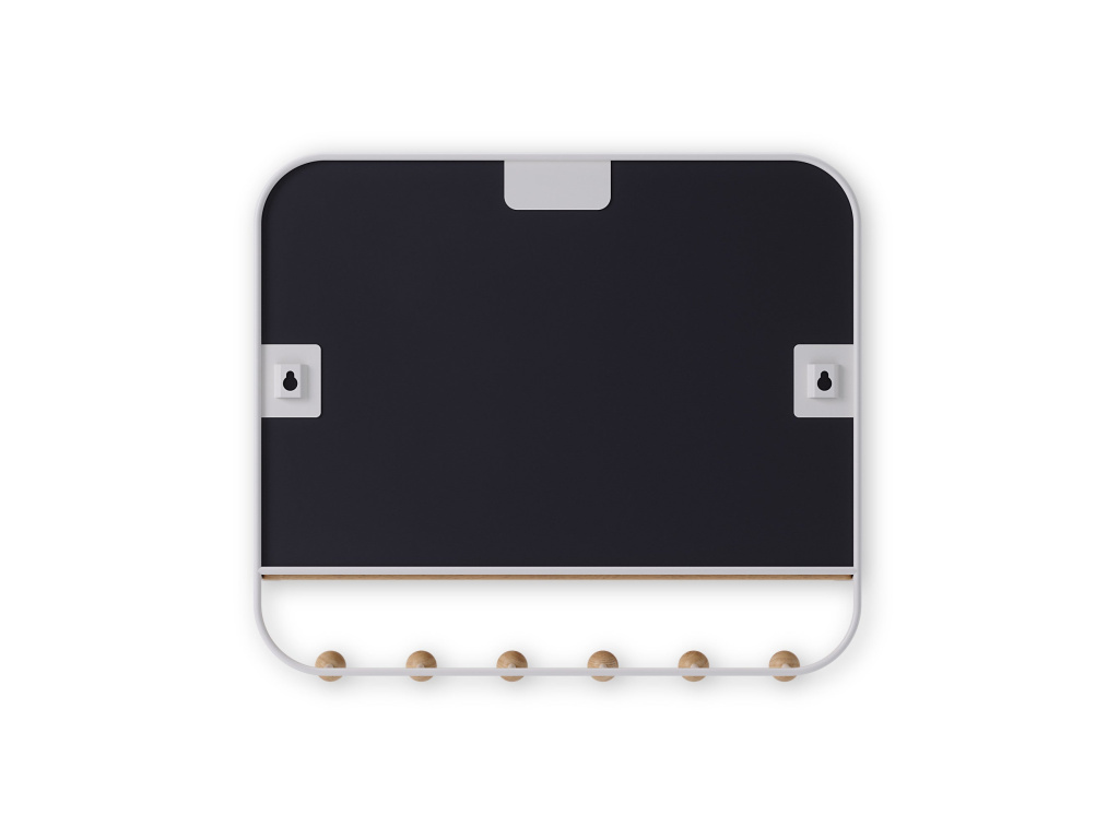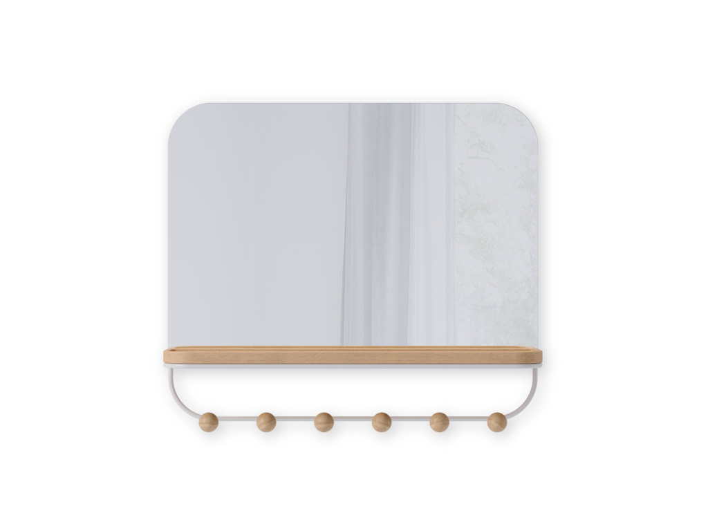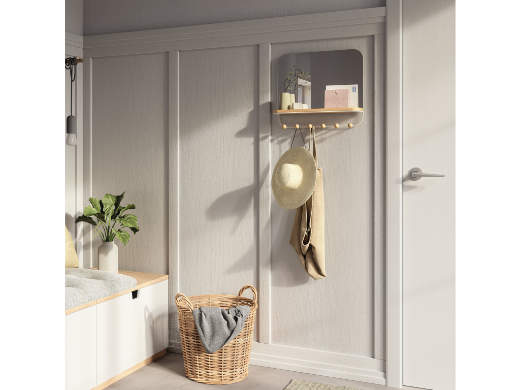 Zrcadlo s integrovaným úložným prostorem má šest dřevěných háčků, které chrání předměty a zároveň jim dodávají dekorativní nádech.